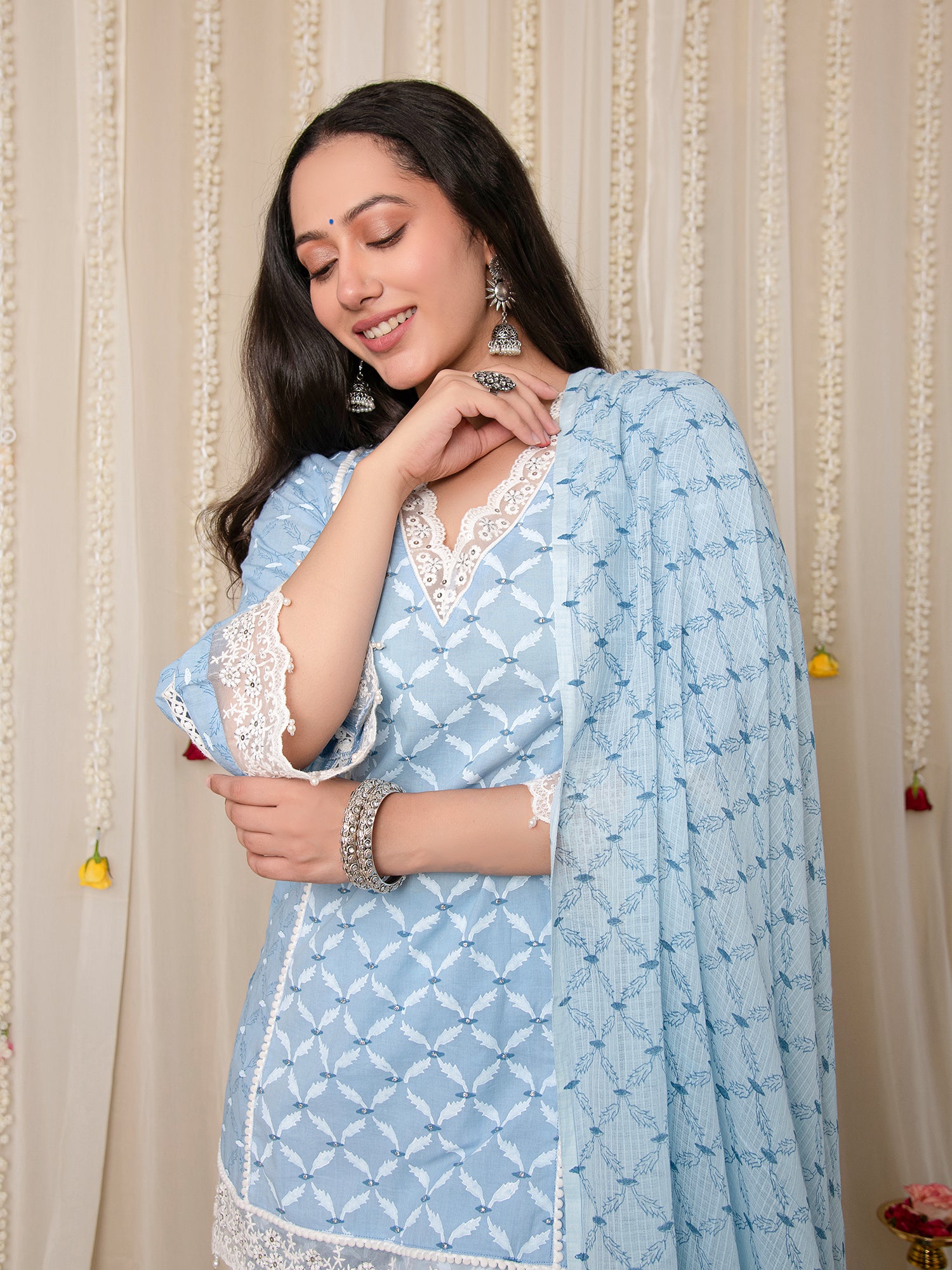 Indulge in the exquisite "Mulmul manik Kurta, Sharara & Dupatta Set" from our enchanting "MOHAR" collection. Our intricately embroidered lace Kurta-Sharara Suit Set gracefully marries charm and allure, akin to celestial stars adorning the night sky. This ensemble not only illuminates your presence but also stands as the epitome of beauty for all your joyful festivities."