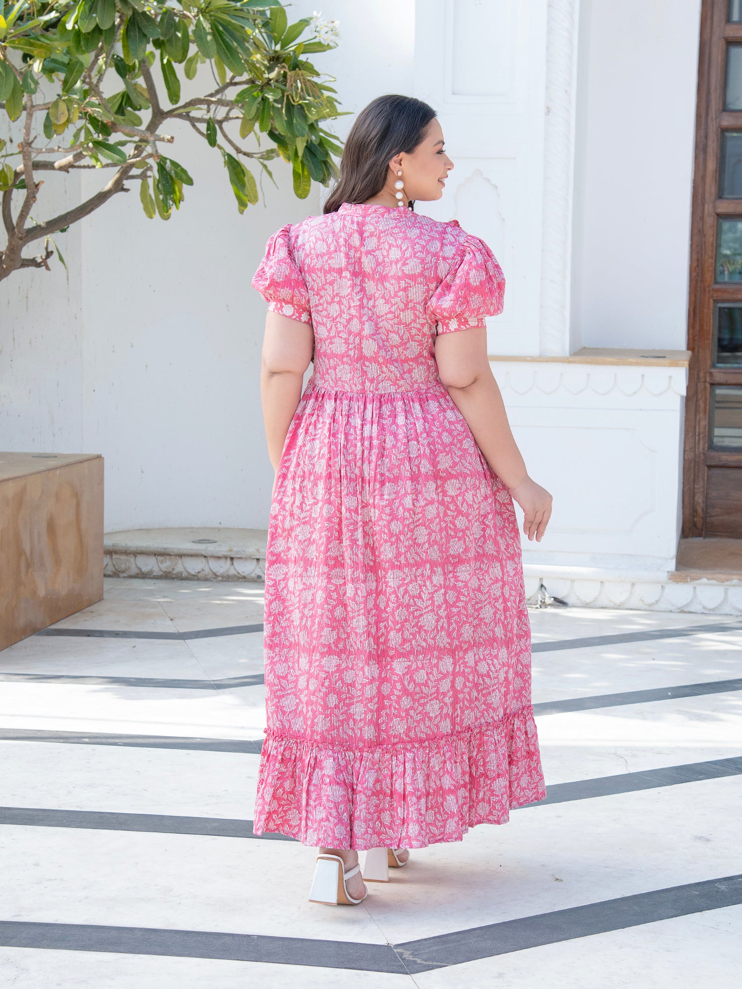 Step into enchantment with our 'PINK FLORAL JAAL BLOCK PRINTED DRESS.' Crafted with precision, the pink floral jaal hand block-printed cotton satin fabric is a canvas of elegance.