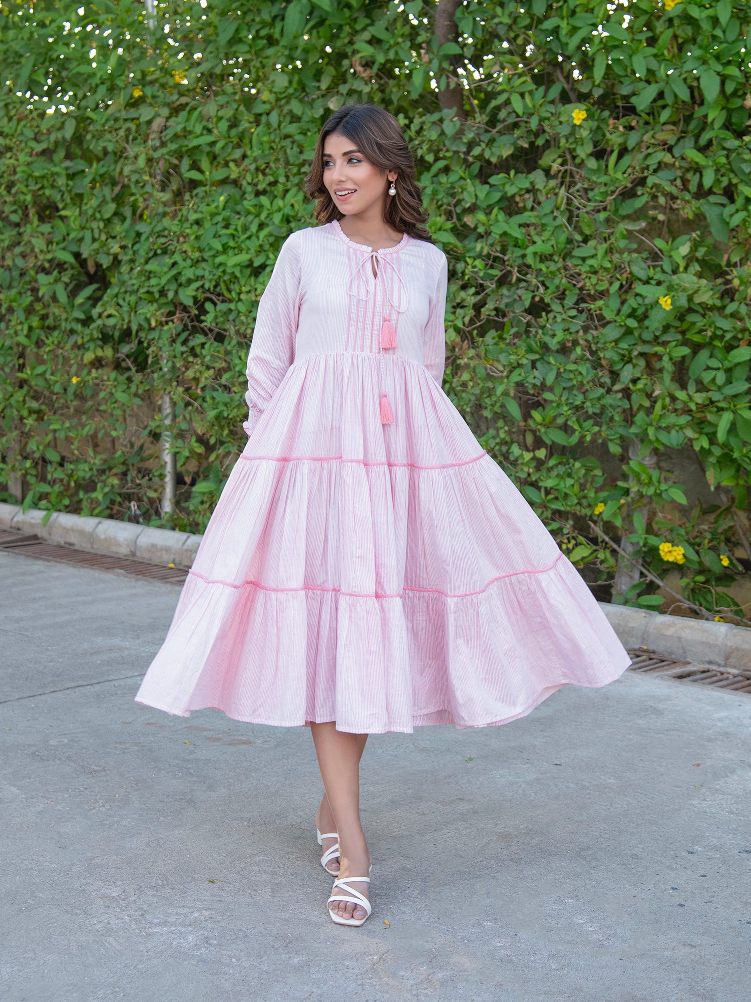 Elevate your style with our Mulmul Sunblush Maxi Dress. Hand-blocked in a soft pink hue, this dress features abundant tiers, a chic yoke with solid fabric detailing, and playful tassel tie-ups for a charming touch. Exude elegance and charm in this enchanting maxi dress.