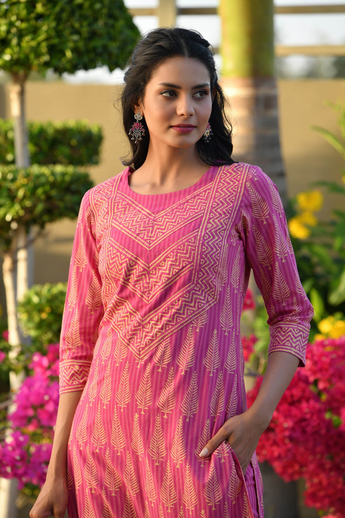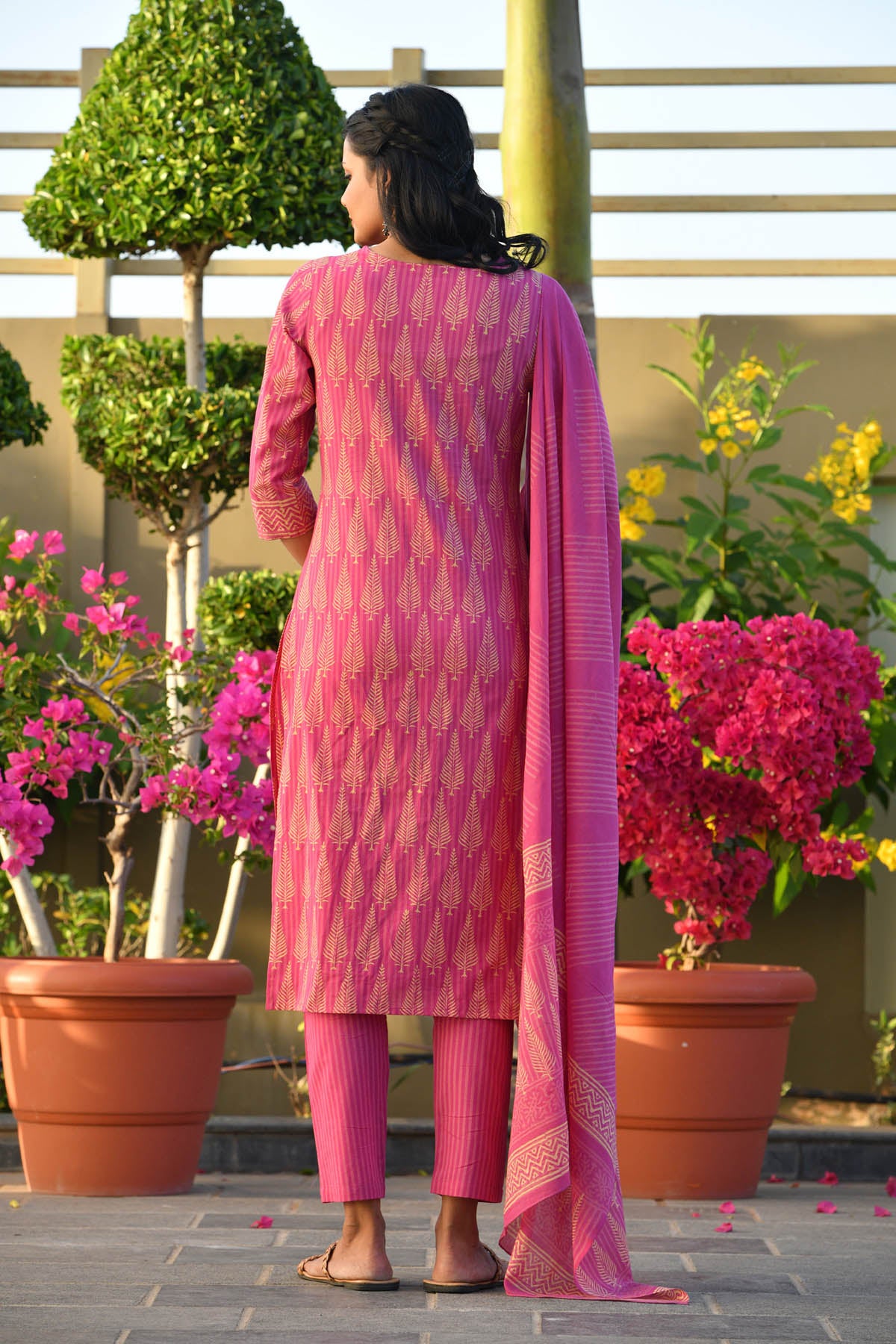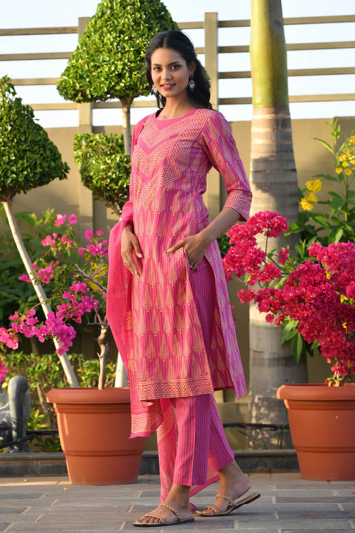 Fuchsia block-printed side slitted straight kurta featuring printed border on yoke, sleeves & bottom edges. Paired with printed cotton pants & dupatta.