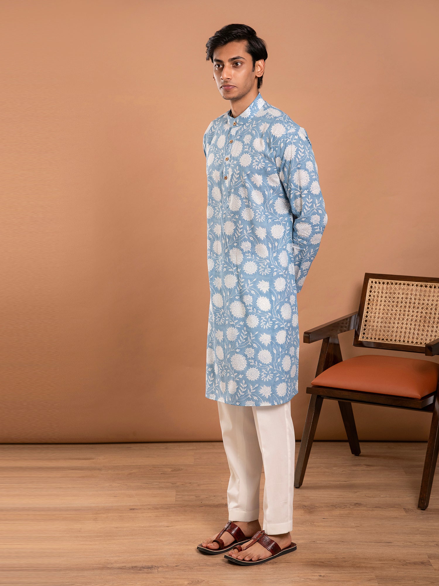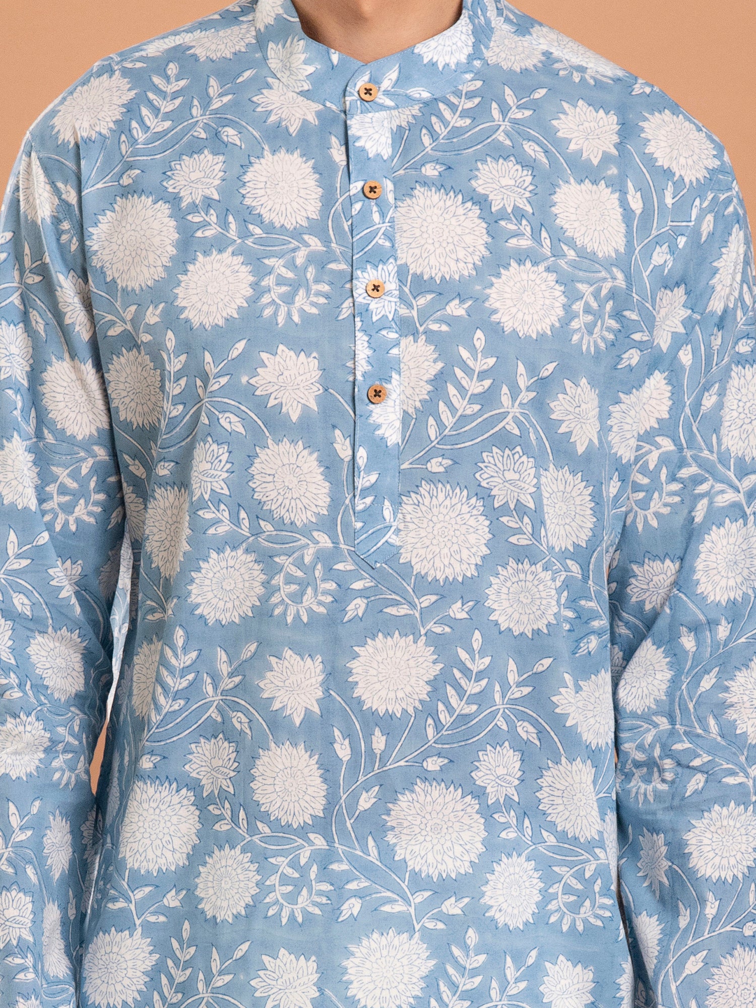 The Mulmul Men's Blue Floral Hand Block Printed Kurta-Pant Set offers a blend of traditional craftsmanship, comfort, and style. Adorned with hand block-printed blue floral motifs. It's suitable for various occasions, from casual outings to festive gatherings, allowing the wearer to make a stylish statement with elegance and cultural flair.