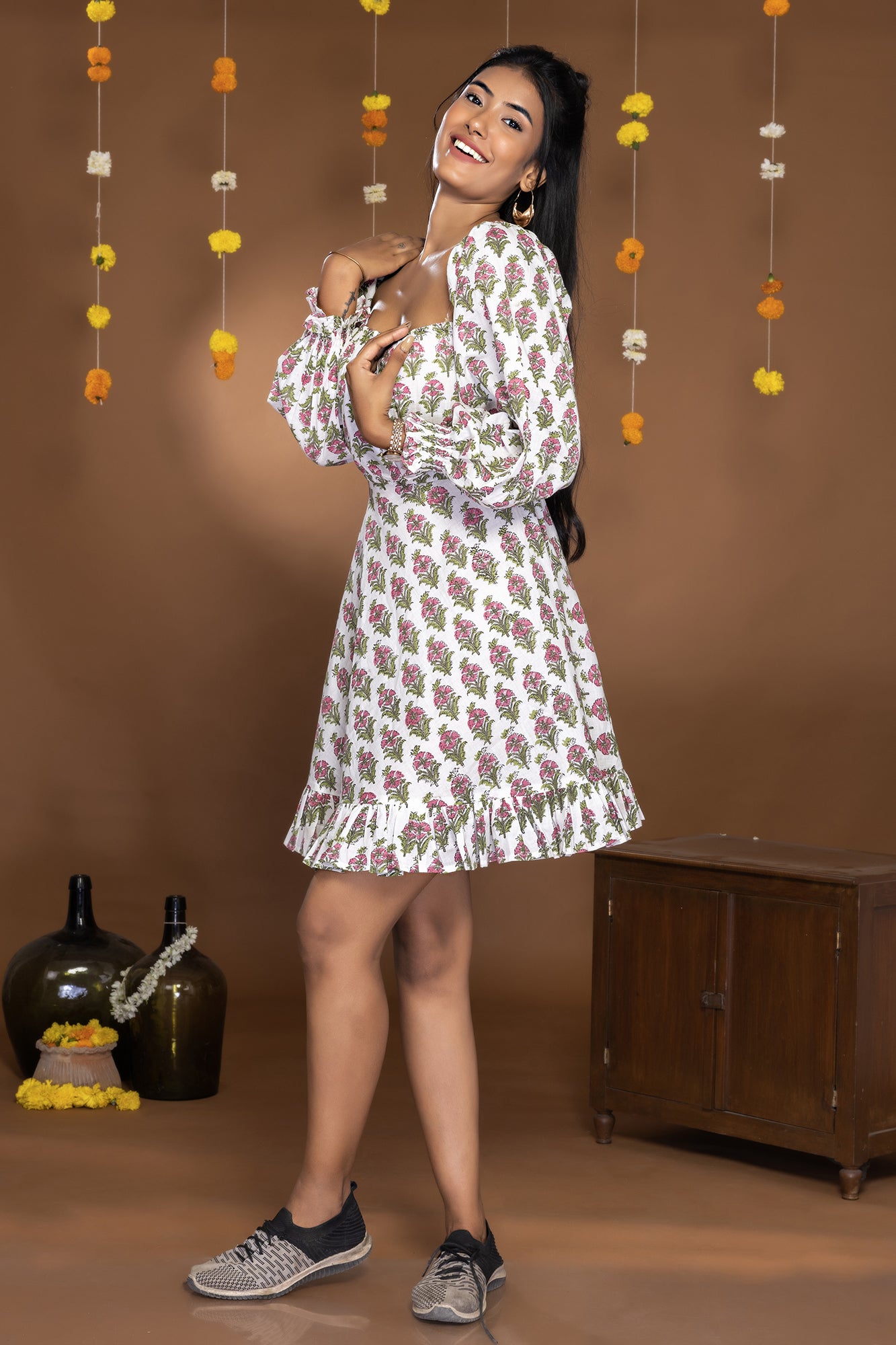 Step into the enchanting world of Sunlit Meadows with this block printed mini dress. Let its vibrant print, charming details, and relaxed silhouette reflect your inner joy and love for natural beauty, making you shine with confidence and timeless allure.