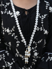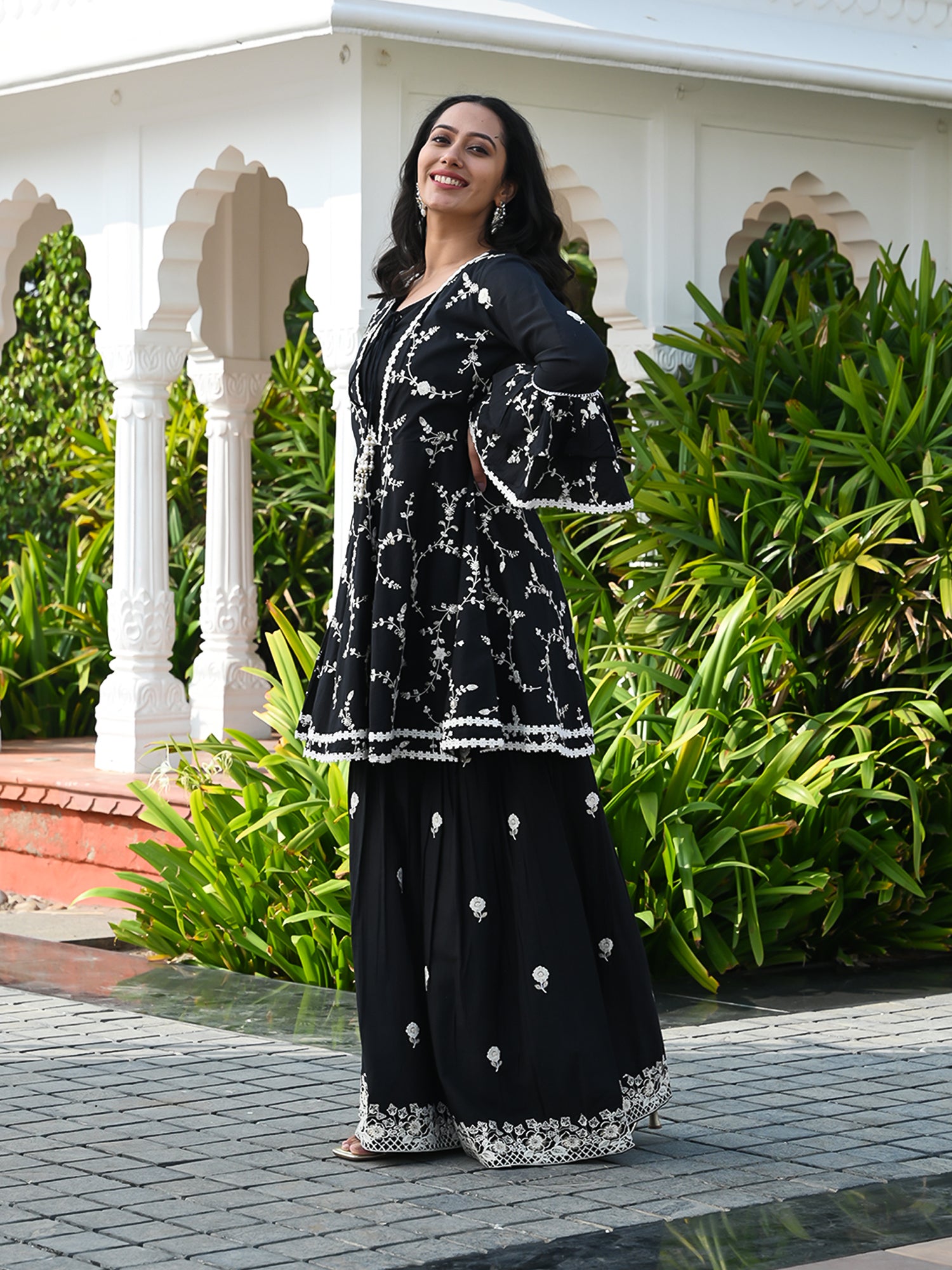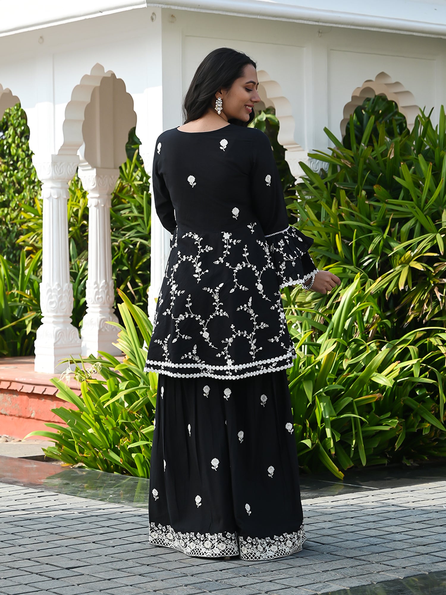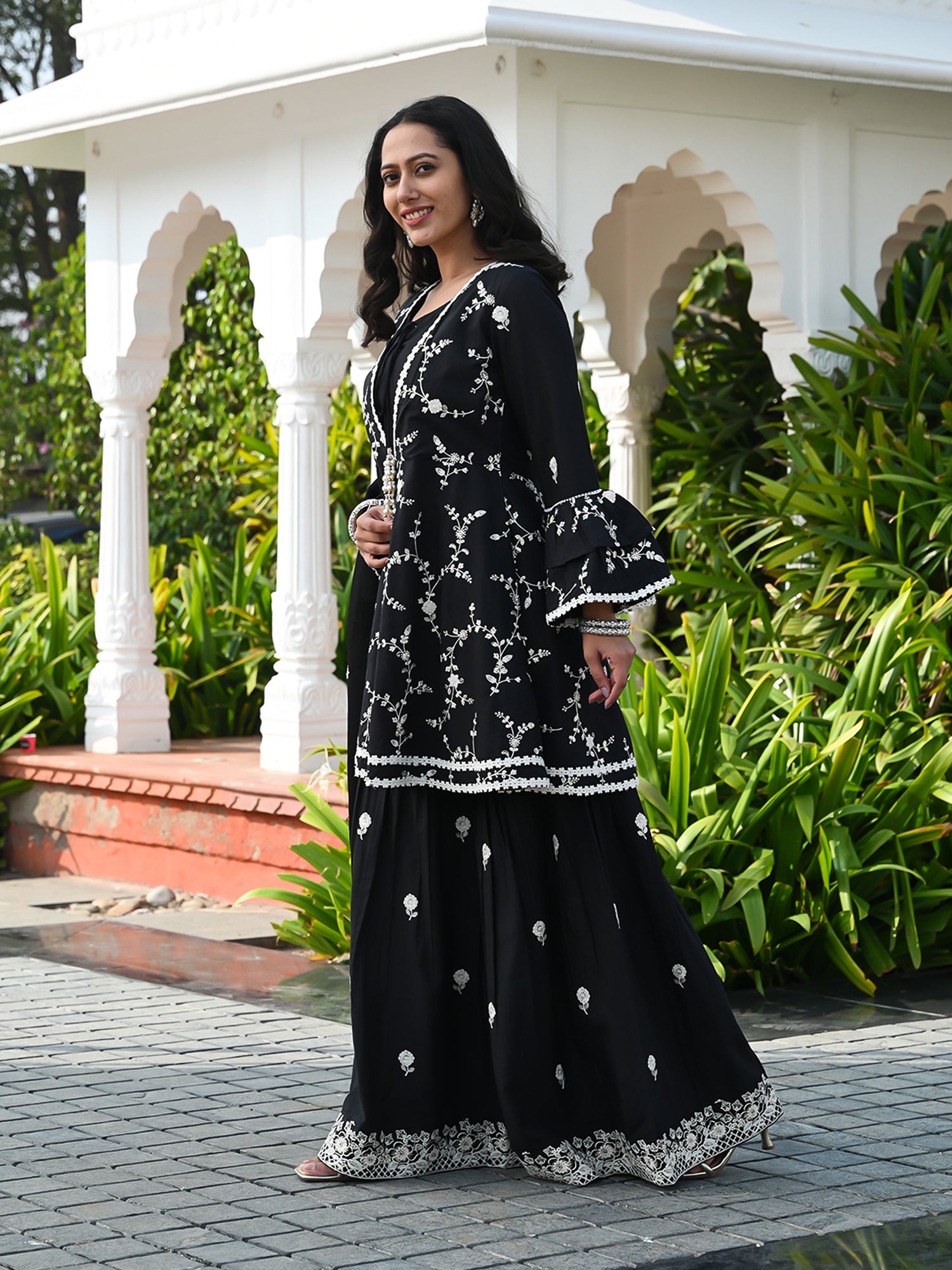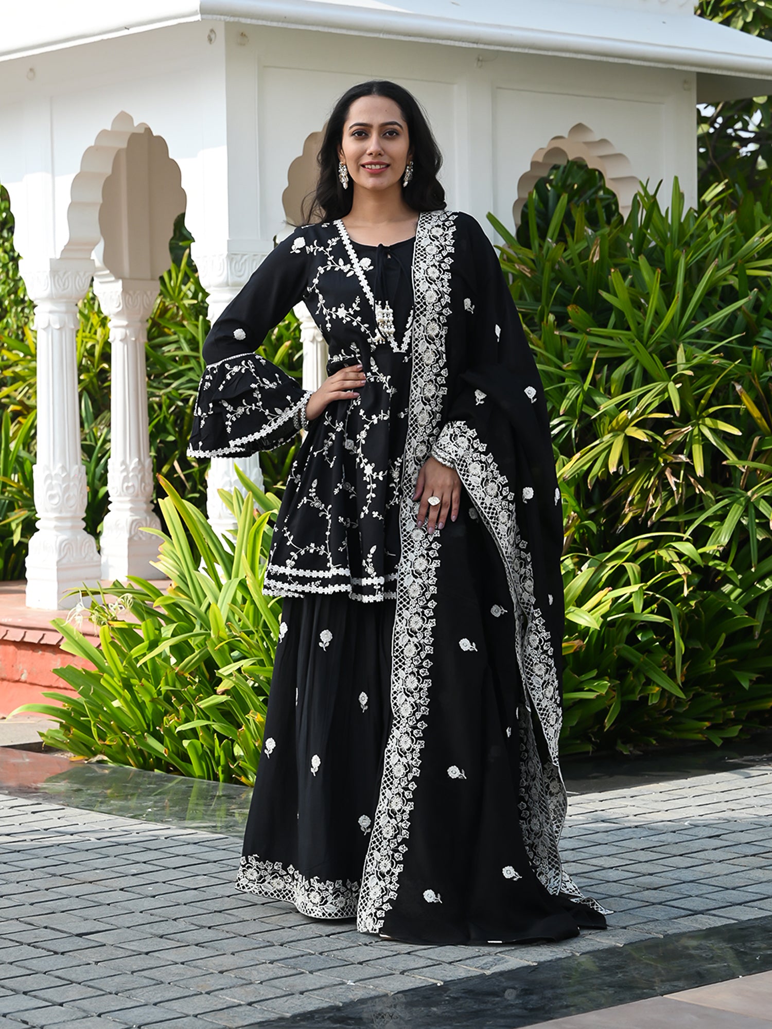 Presenting our stylish and cozy Indian ensemble, tailored for festive joy. The sharara set features intricate white thread embroidery, forming a delightful floral pattern along with lace detailing. Paired with cotton booti embroidered sharara, the outfit is perfected with a silk organza dupatta. The dupatta boasts a embroidered border and is adorned with embroidered booti all over, completing this beautiful and graceful look.