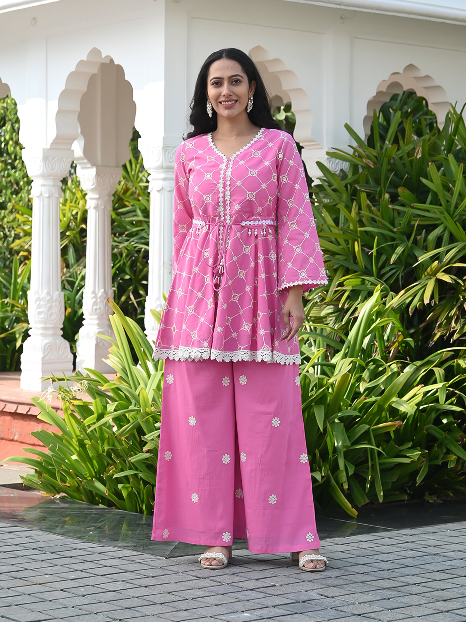 Enchanting Mulmul Eileen Magenta Pink Short Kurta And Flared pant adorned with intricate white thread embroidery. while delicate white pearl detailing adds a touch of sophistication. A celebration essential for your glamorous wardrobe.