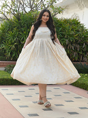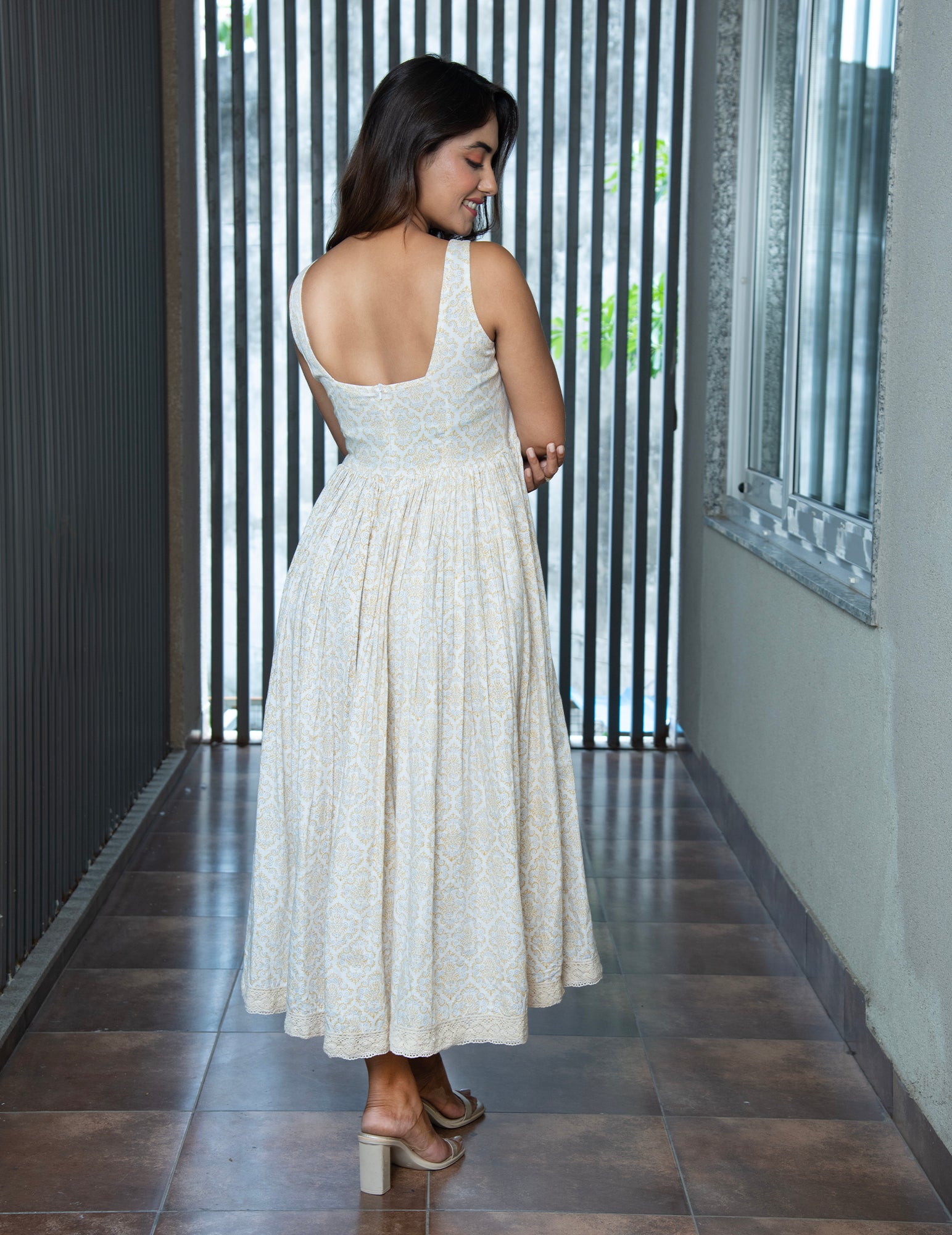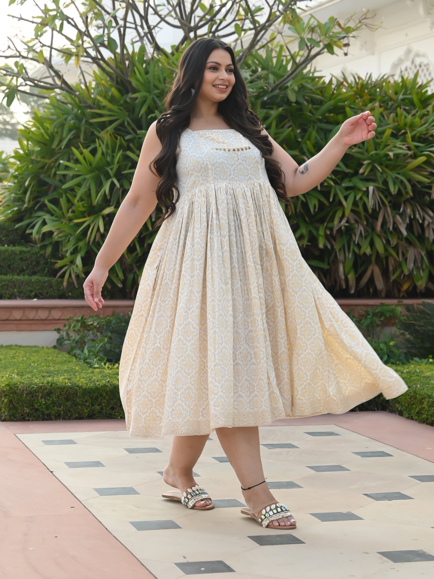 Introducing the "EILEEN" Cotton Satin Full Length Hand Block Printed Sleeveless Dress: Crafted from luxurious cotton satin fabric, the "EILEEN" dress is a perfect blend of comfort and style.