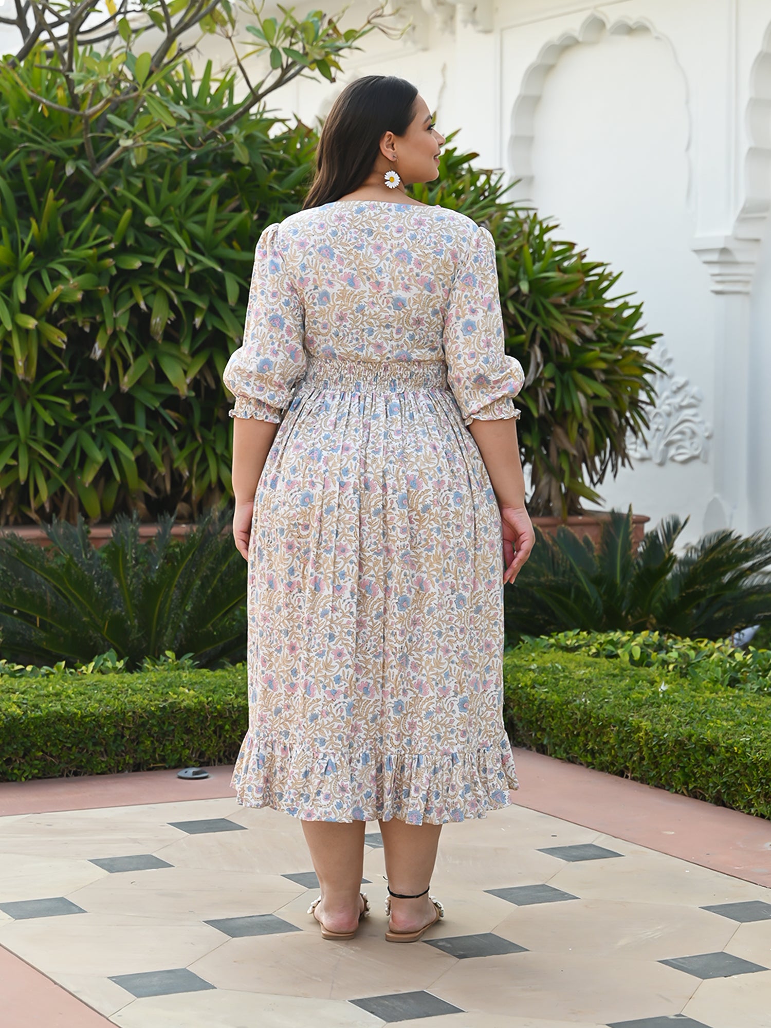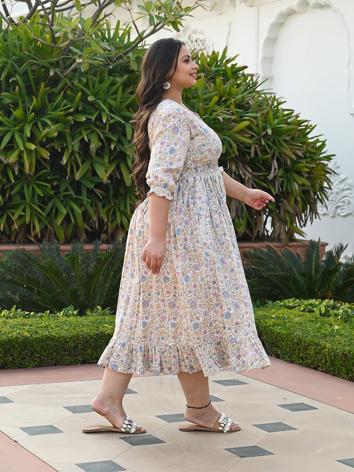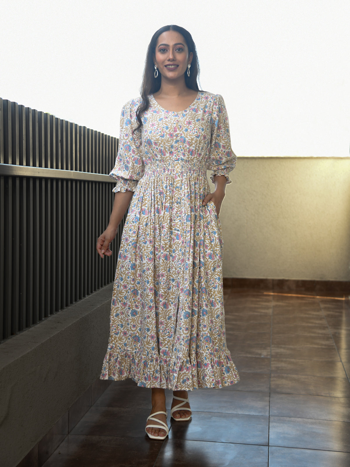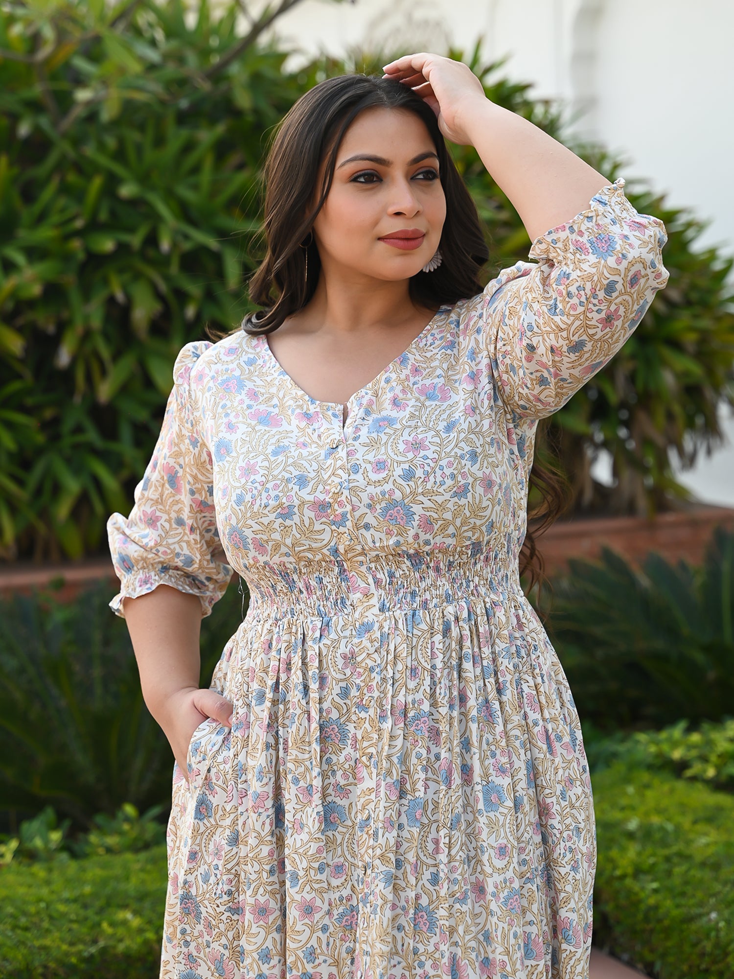 Crafted in a mesmerizing off-white shade, this dress features a delicate pastel floral jaal block print, creating an enchanting and feminine look.