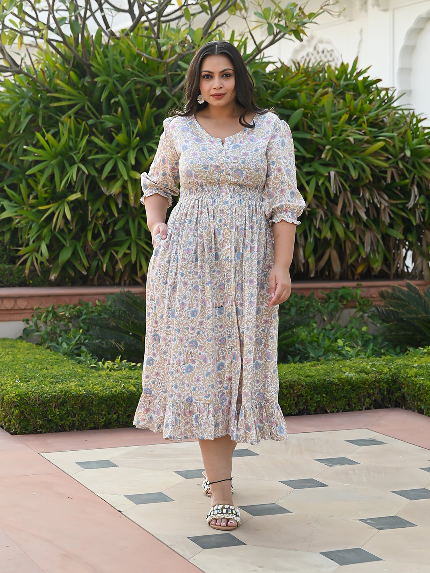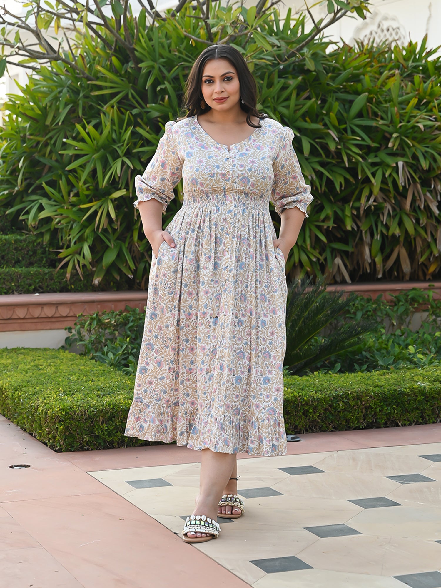 Embrace the beauty of the season with our "Sunshine Soiree" collection's standout piece, PRASHI JAAL BLOCK PRINTED COMFY DRESS.