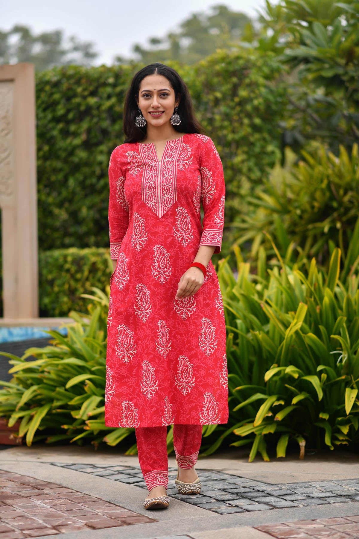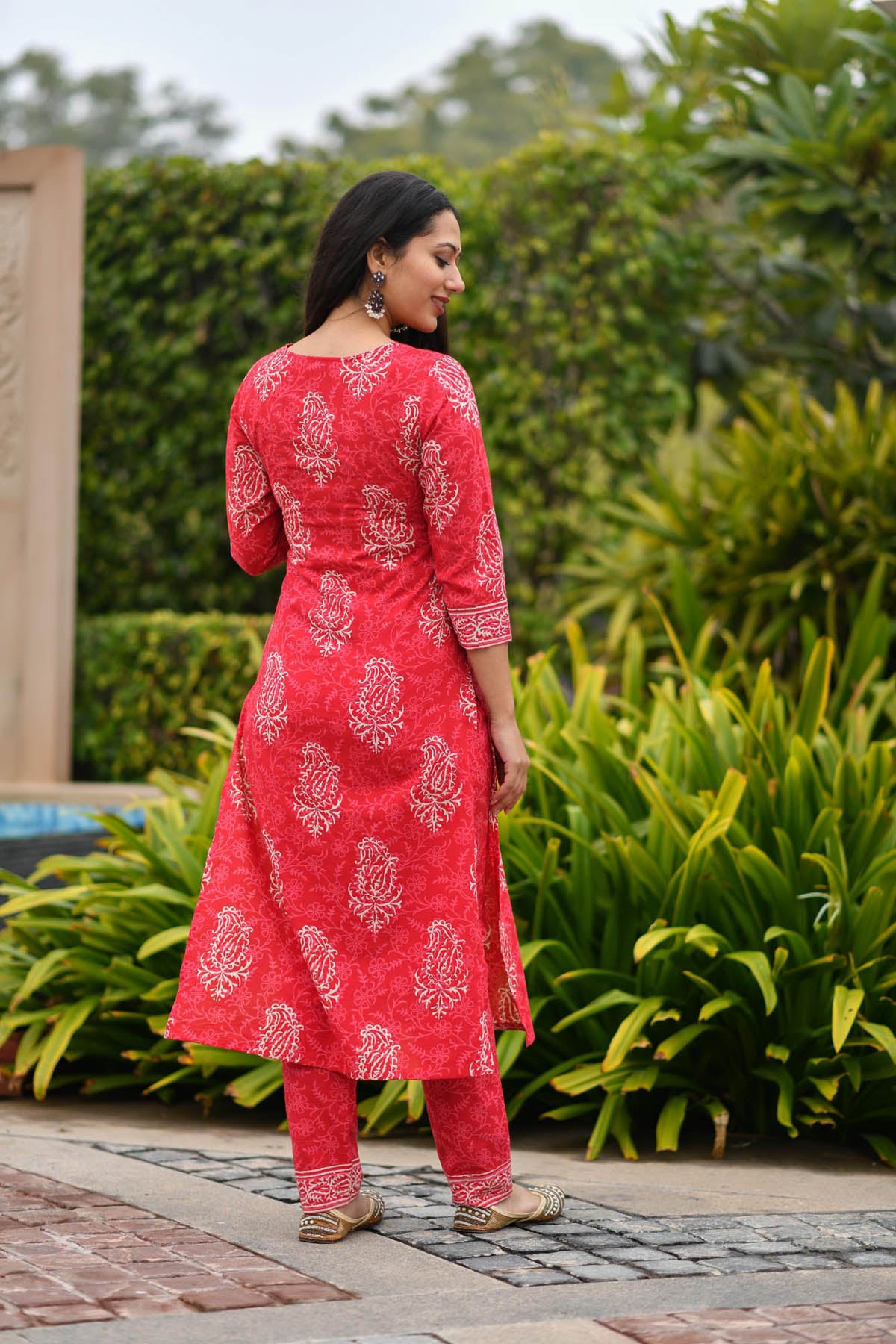Red block-printed side slitted straight kurta featuring printed border on yoke & sleeve edges. Paired with printed cotton pants & dupatta.