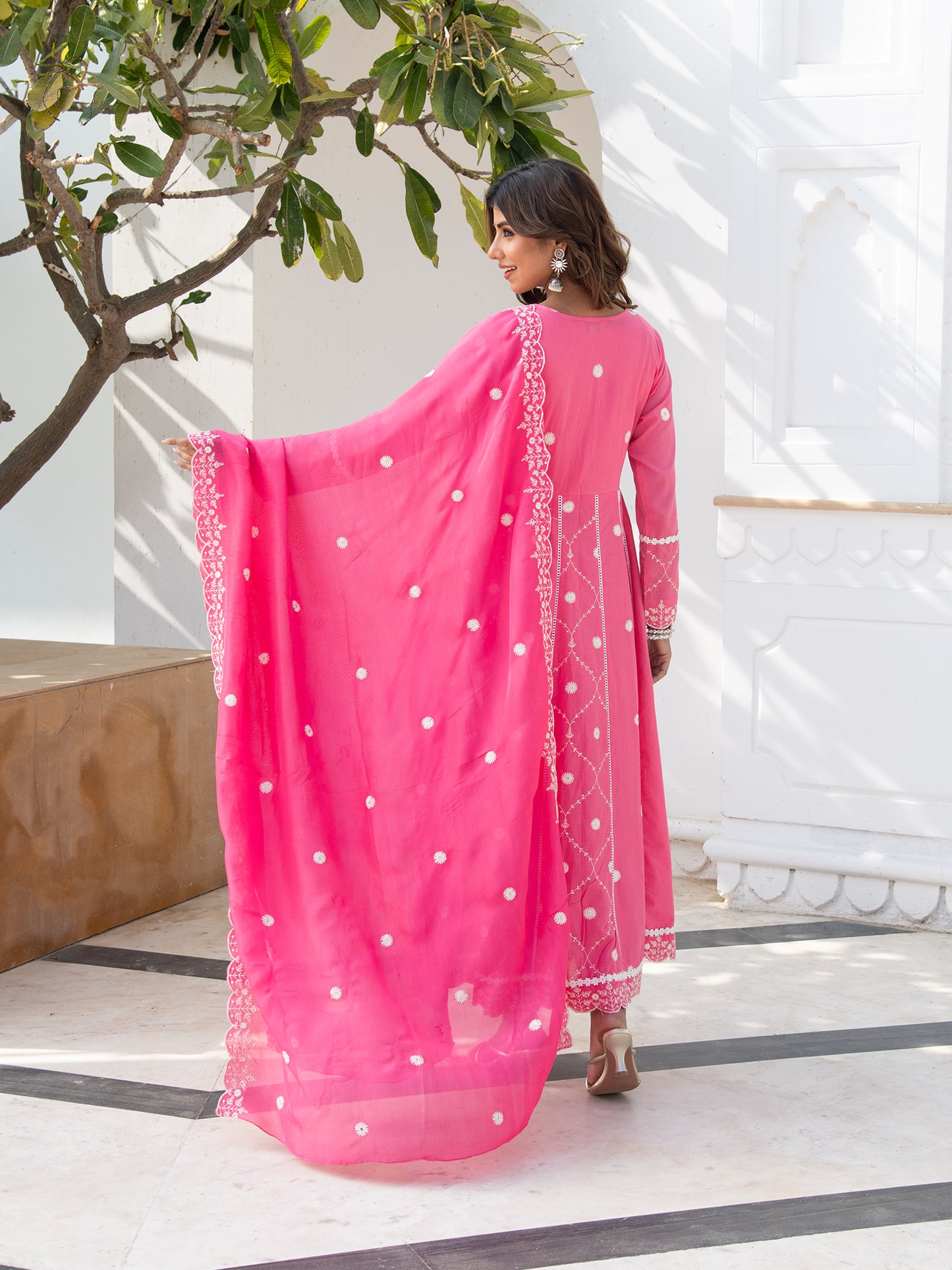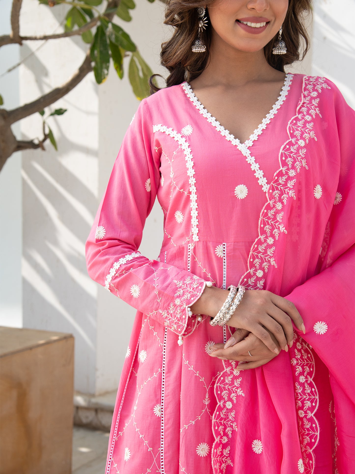 Presenting our stylish and cozy Indian ensemble, tailored for festive joy. The anarkali set features intricate white thread embroidery, forming a delightful floral pattern along with lace detailing. Paired with cotton booti embroidered pants, the outfit is perfected with a silk organza dupatta. The dupatta boasts a scallop border and is adorned with embroidered booti all over, completing this beautiful and graceful look.