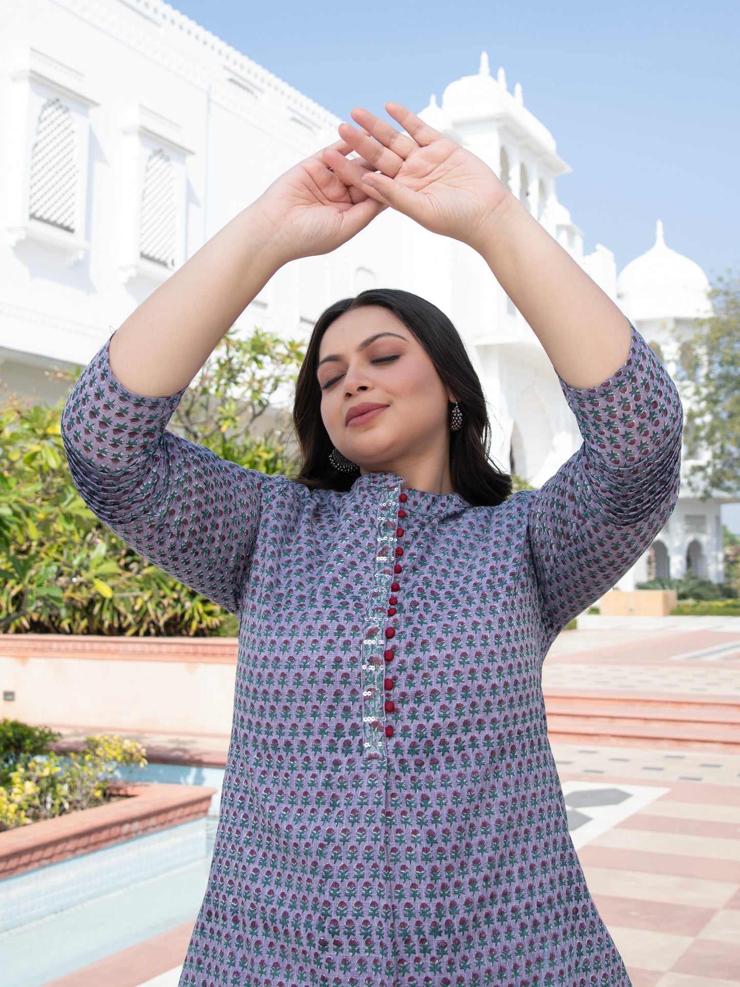 Crafted with care, the dress showcases the intricate artistry of hand block printing on lightweight and breathable Kota Doria fabric, ensuring comfort all day long.