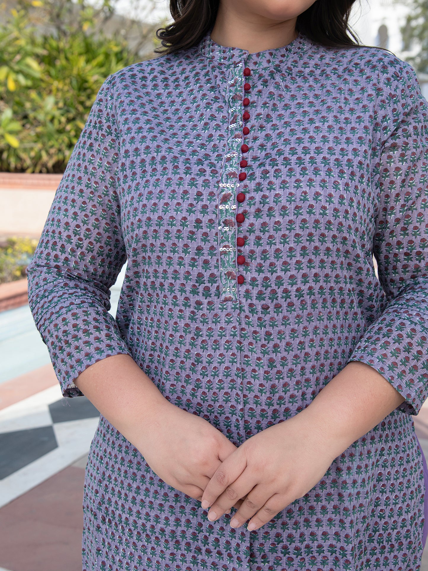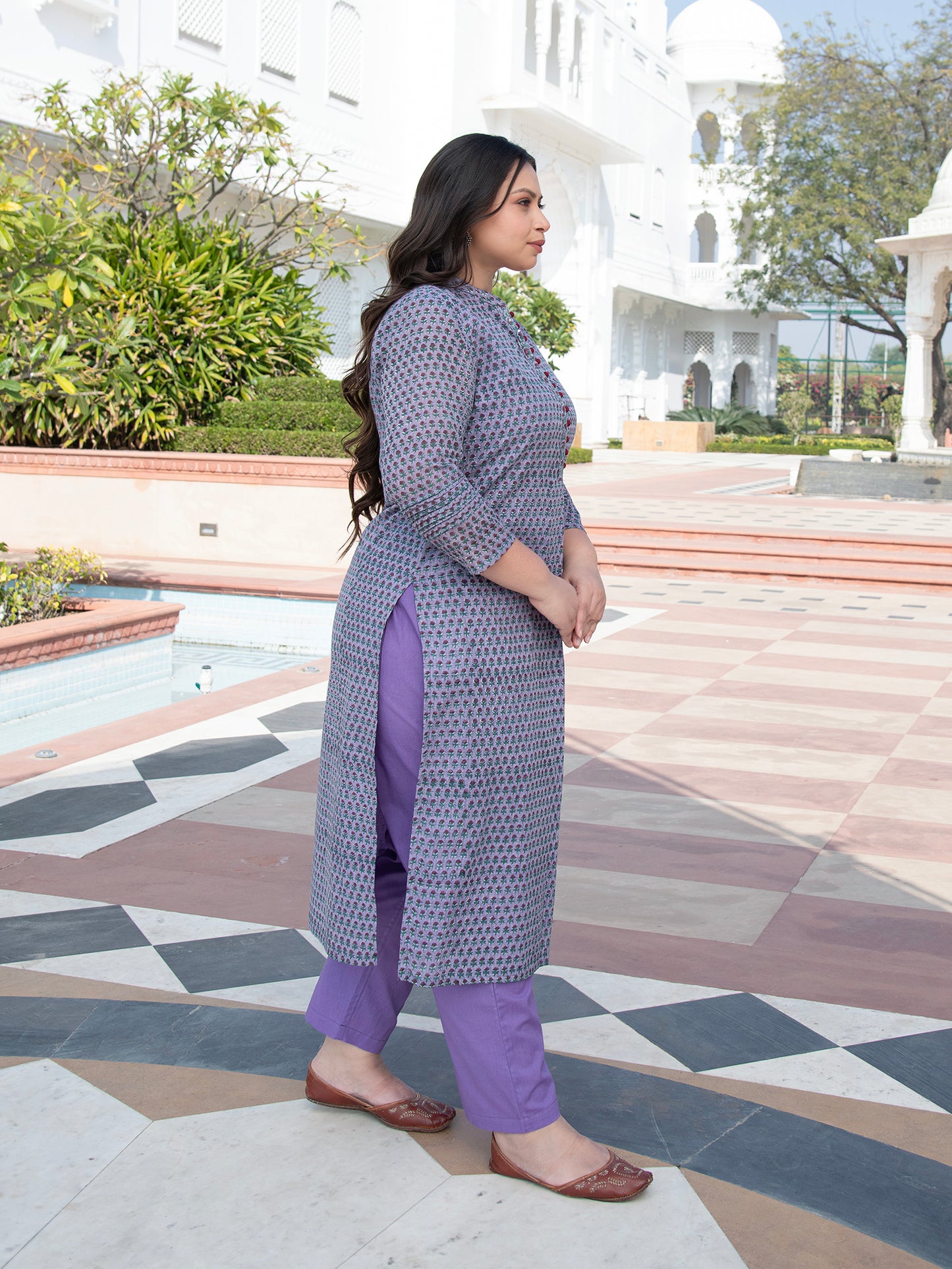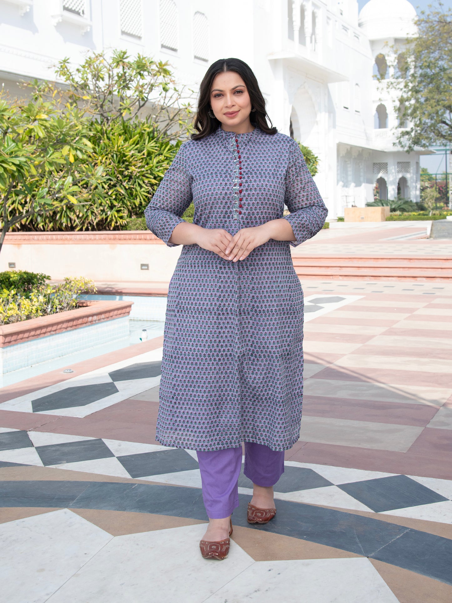 Introducing the exquisite "MAHI KOTA DORIA BLOCK PRINTED KURTA & PANT SET" from our enchanting hand block printed kurta set collection. This kurta set features a stunning shade of purple that brings a refreshing touch of nature's beauty to your wardrobe.