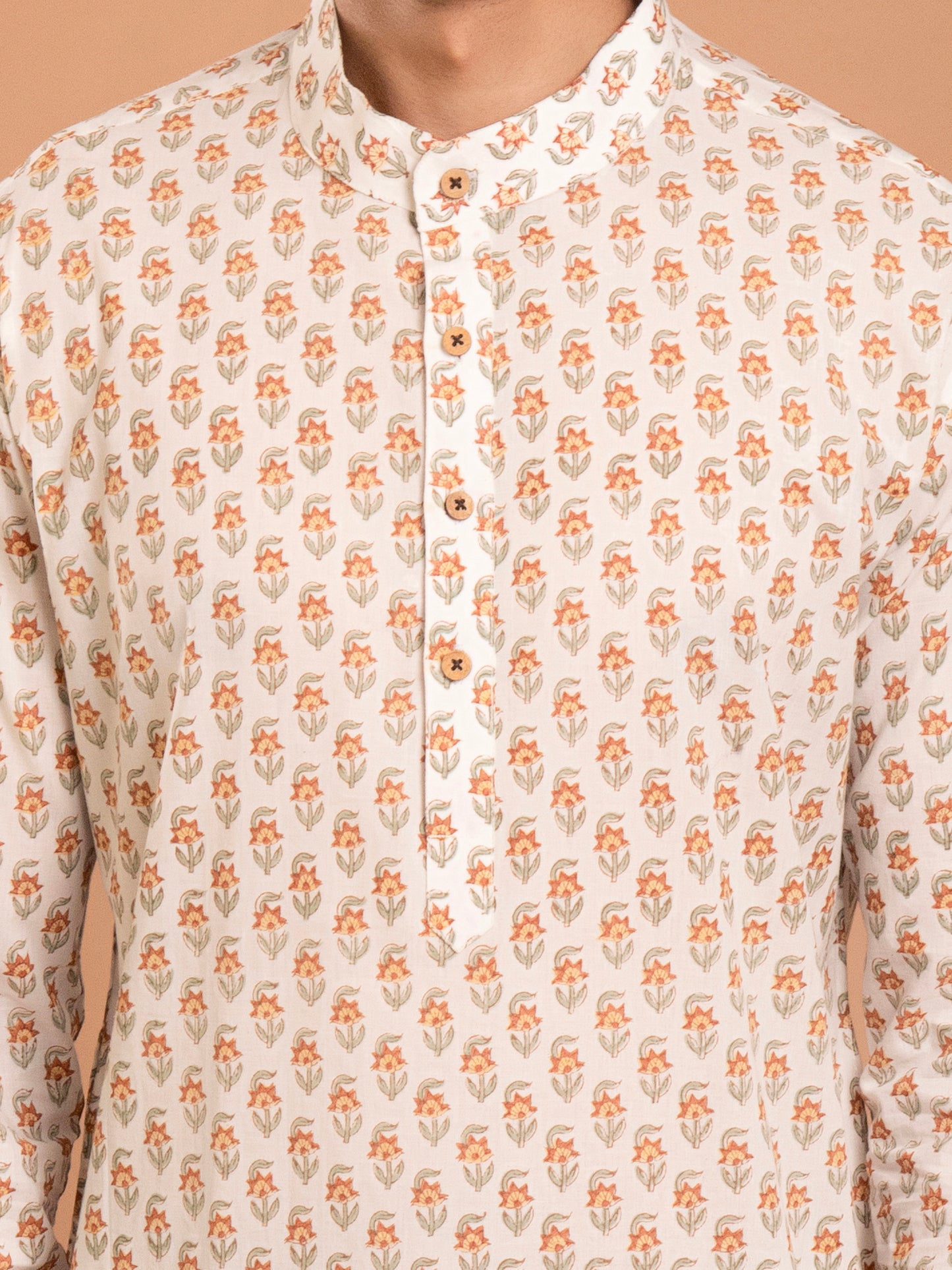 The "Mulmul OFF-WHITE HAND BLOCK PRINTED KURTA-PANT SET" sounds like a stylish and versatile ensemble. The kurta is crafted from high-quality black cotton fabric, which offers both comfort and durability. The small motif block print adds a touch of sophistication and visual interest to the design, making it stand out and making it suitable for various occasions, from casual outings to festive gatherings.