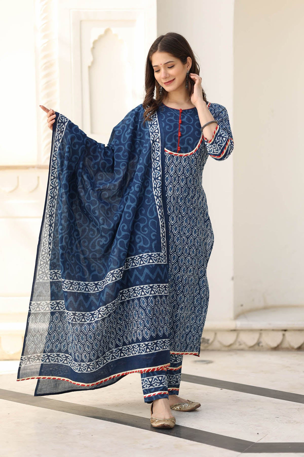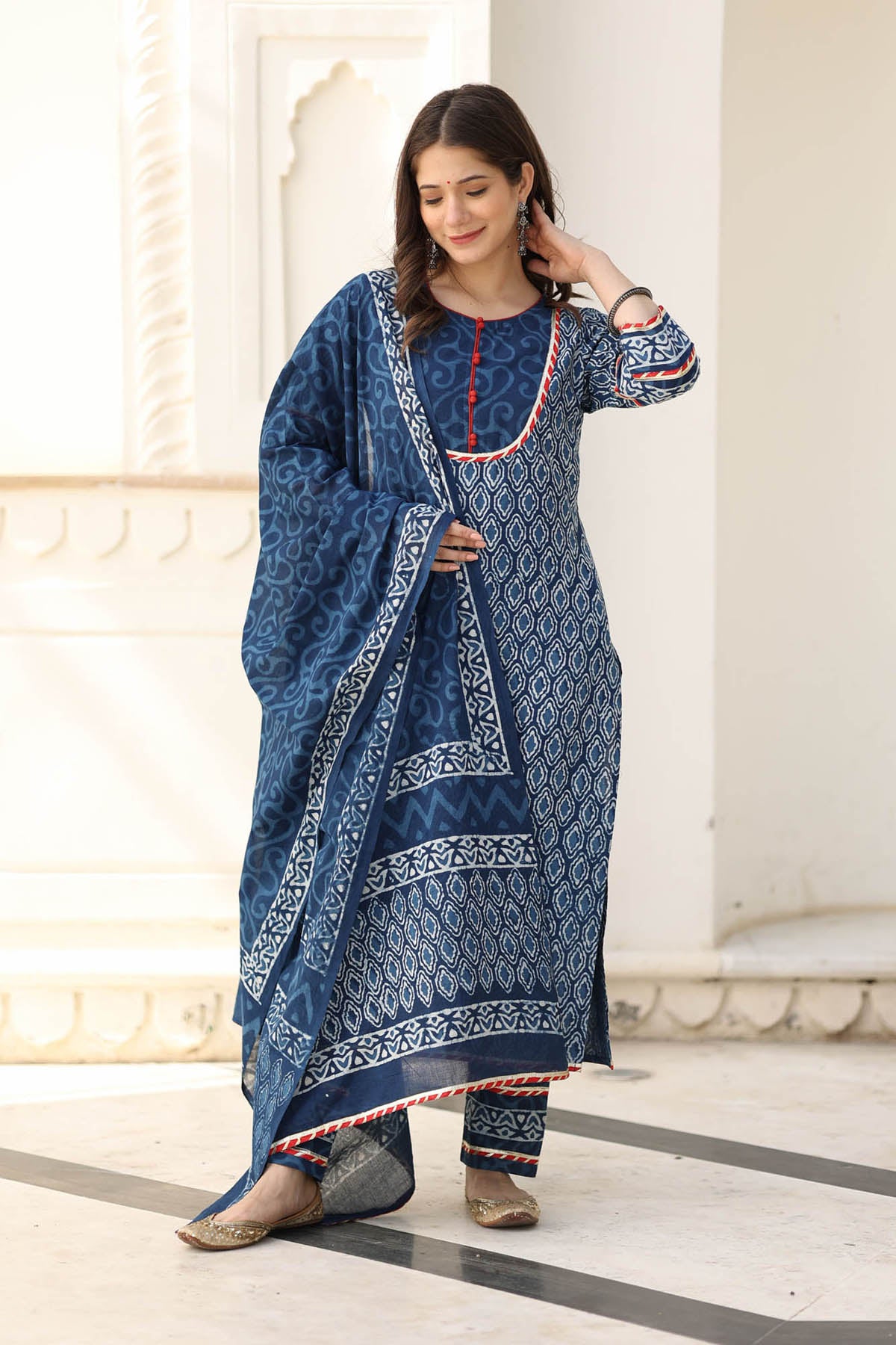 Navy block-printed side slitted straight kurta featuring maroon potli buttons & magzi details. Paired with printed cotton pants & dupatta.