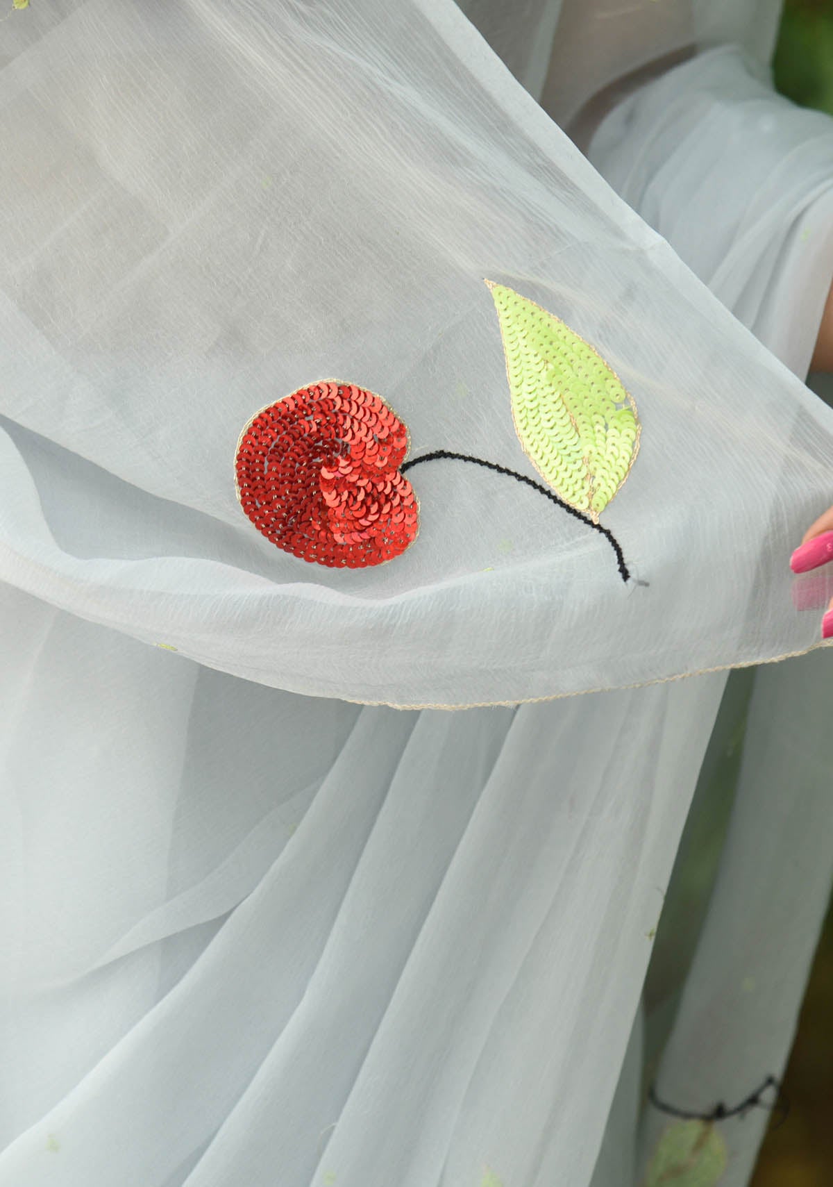 Description: Our NURI chiffon saree features red & pastel green sequin and aari cherry motifs. It is made using pure chiffon, making it festive yet light weighted. Each saree is hand-dyed & Handcrafted in Jaipur for you with love ❤