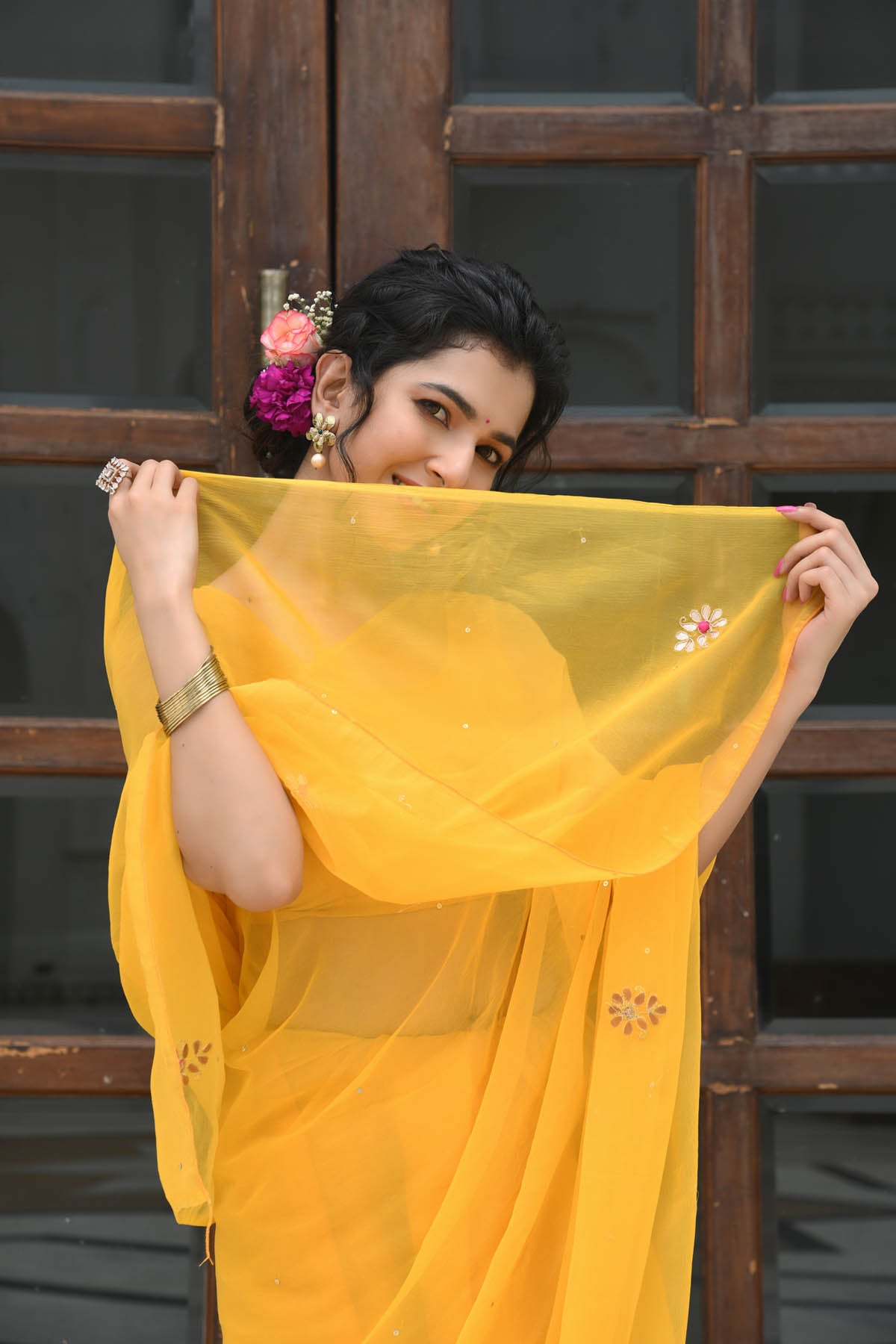 Description: Our SUNEHRI chiffon saree features gotta patti & fuchsia button work motifs with golden sequin spread. It is made using pure chiffon, making it festive yet light weighted. Each saree is hand-dyed & Handcrafted in Jaipur for you with love ❤