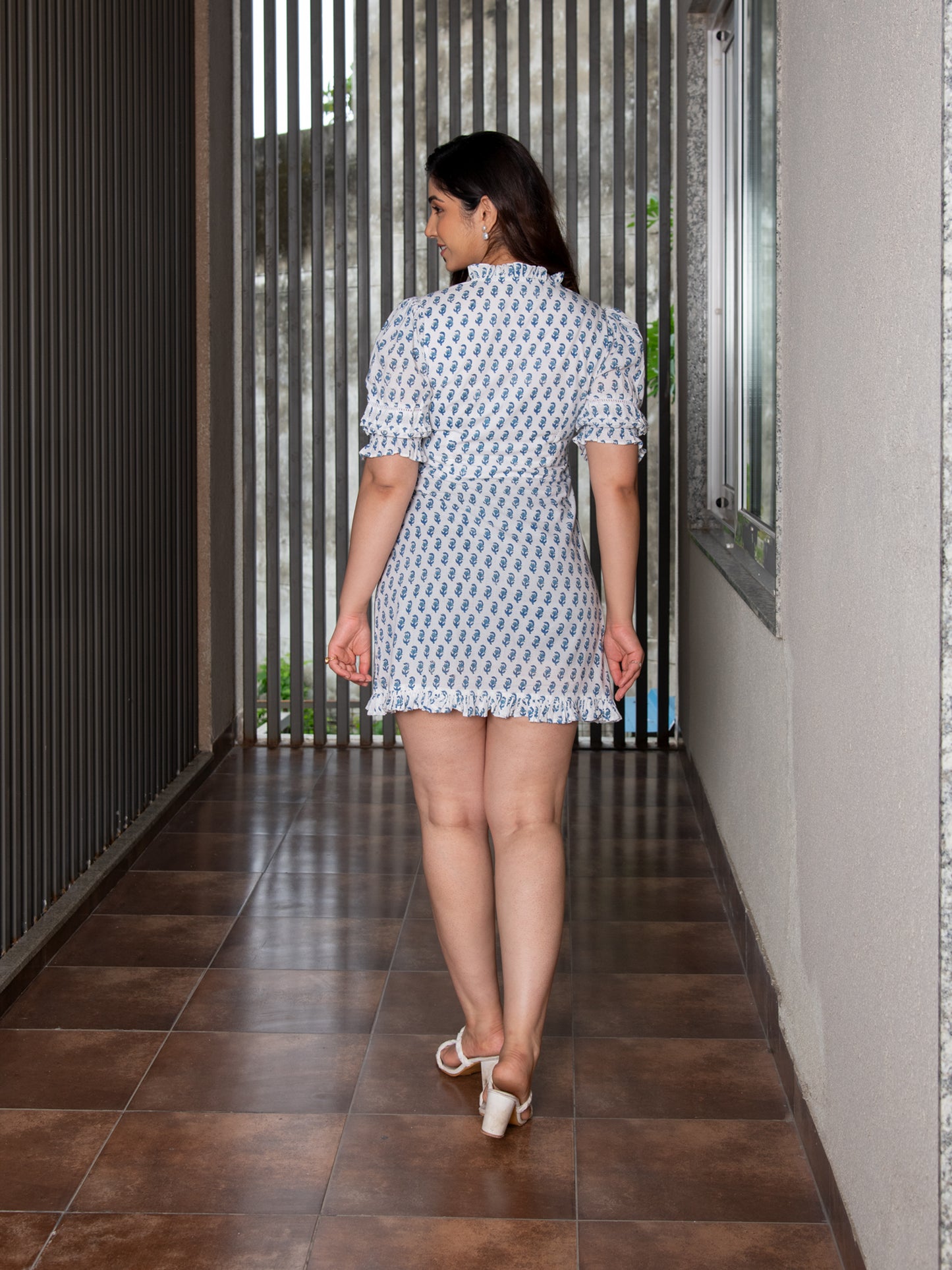 Step into the radiant world of Sunshine Soiree with our BISHTI MOTIFS HAND BLOCK PRINTED DRESS. This exquisite dress showcases a captivating blend of white and blue tiny motifs, meticulously hand block printed onto soft and breathable fabric.