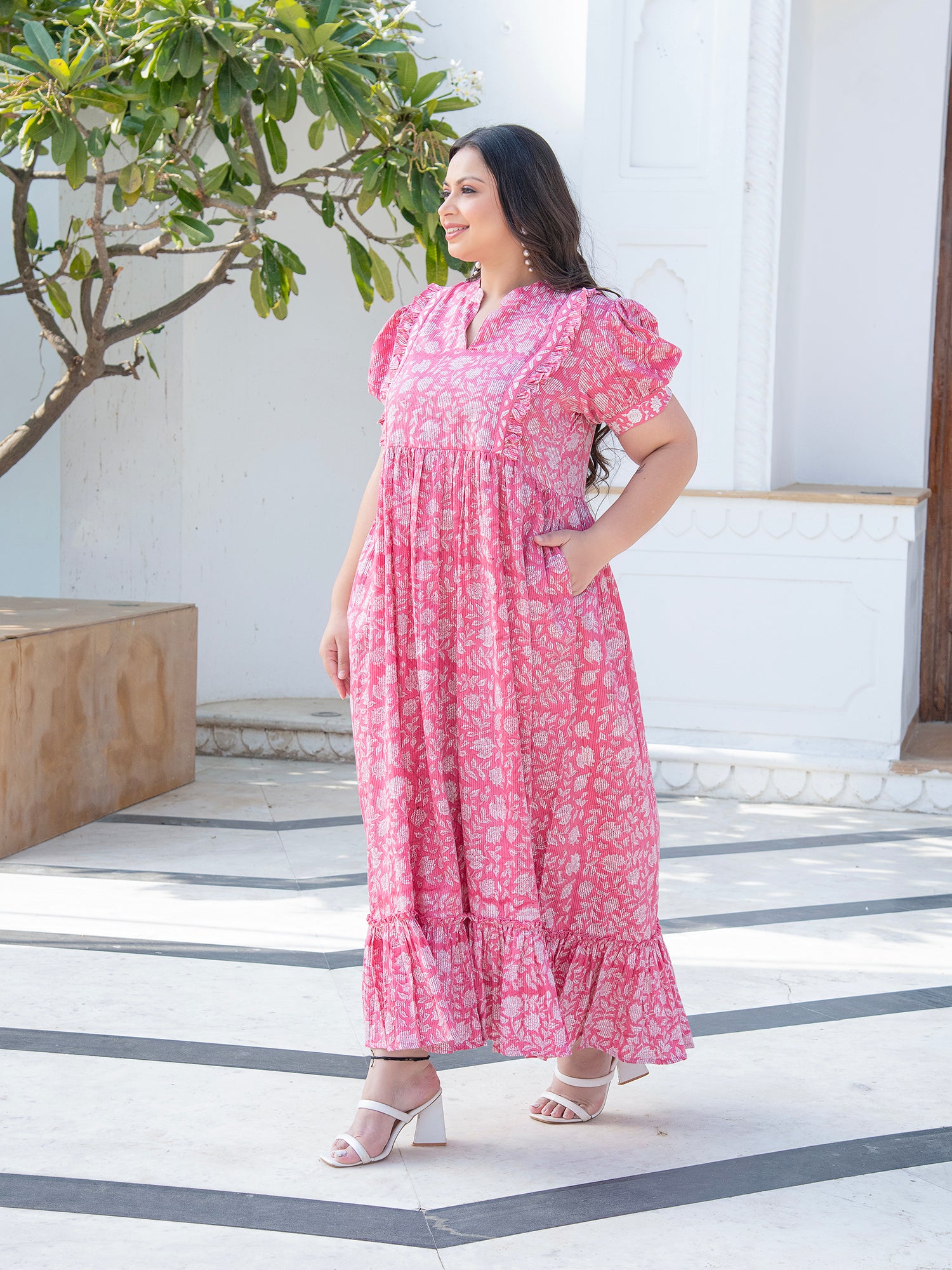 Step into enchantment with our 'PINK FLORAL JAAL BLOCK PRINTED DRESS.' Crafted with precision, the pink floral jaal hand block-printed cotton satin fabric is a canvas of elegance.