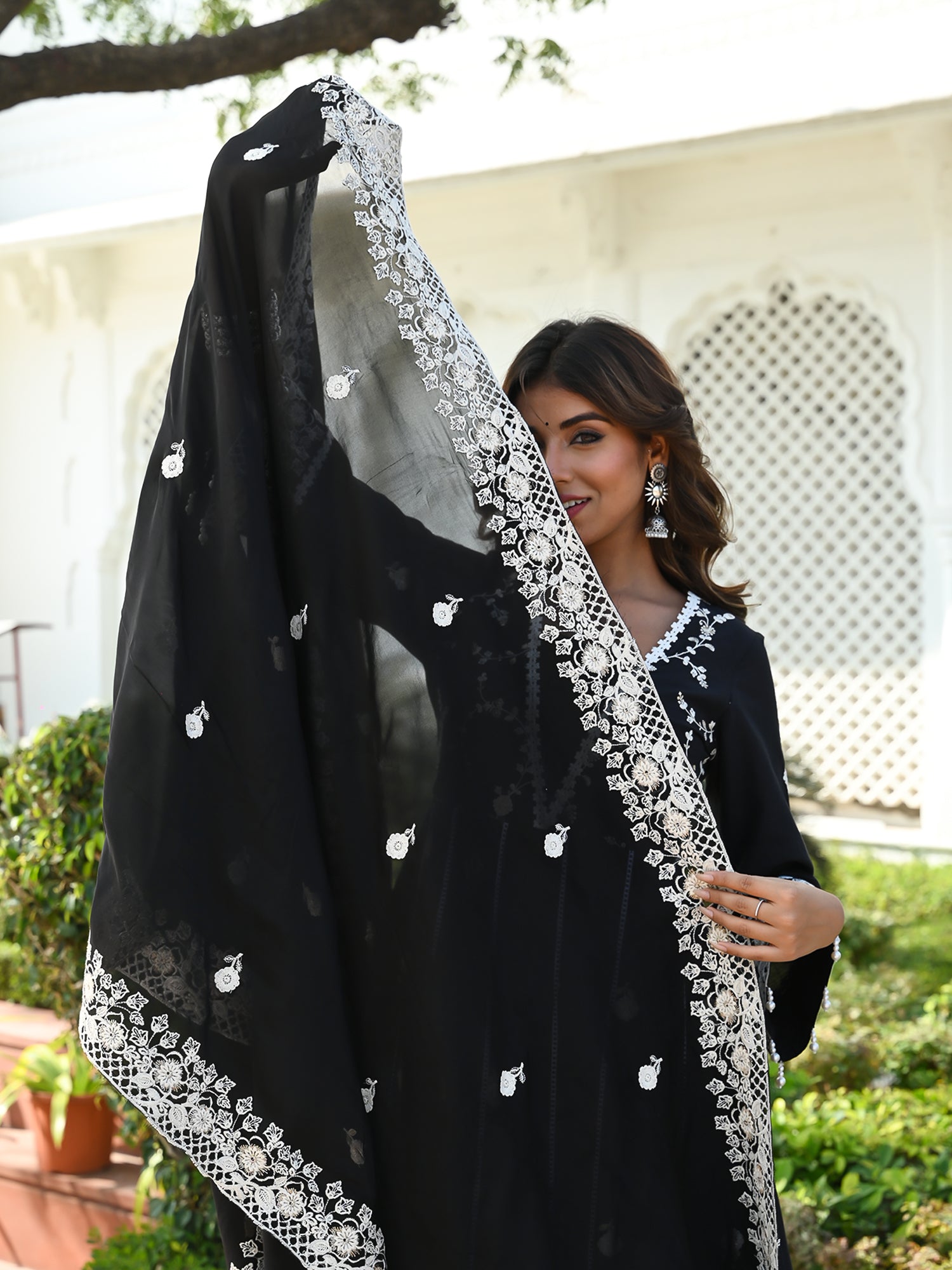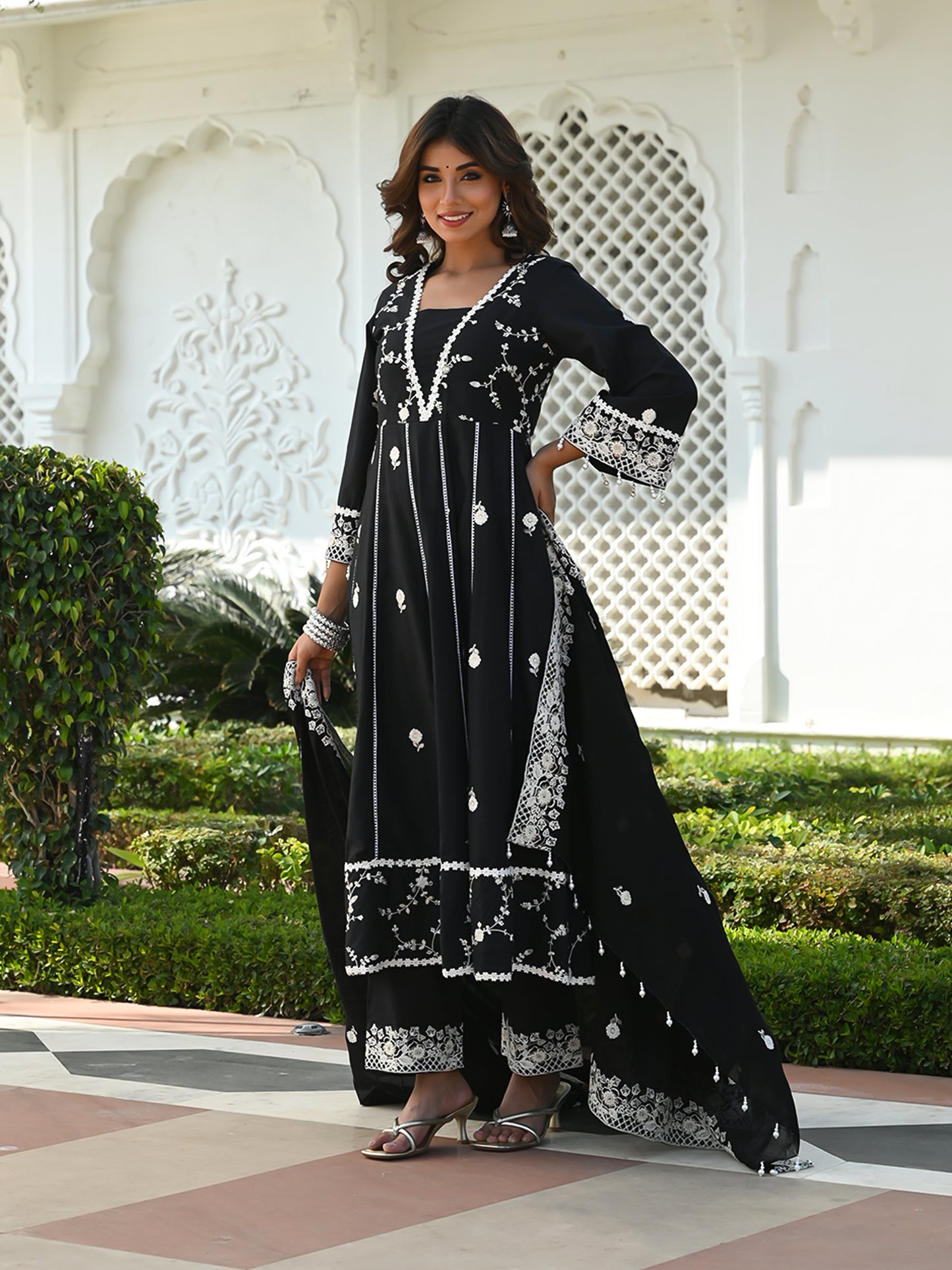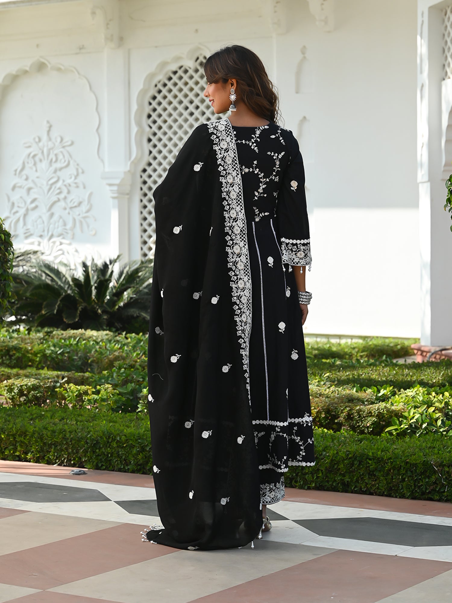 Enchanting mulmul Black Luna Anarkali Kurta adorned with intricate white thread embroidery. Silk organza dupatta exudes regality, while delicate white pearl detailing adds a touch of sophistication. A celebration essential for your glamorous wardrobe.