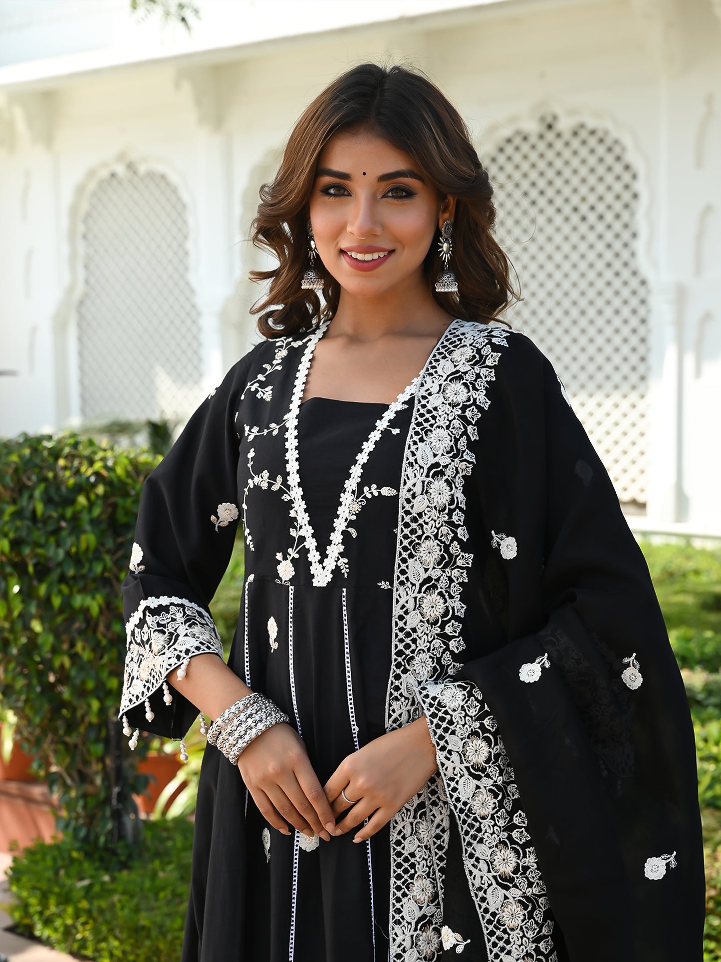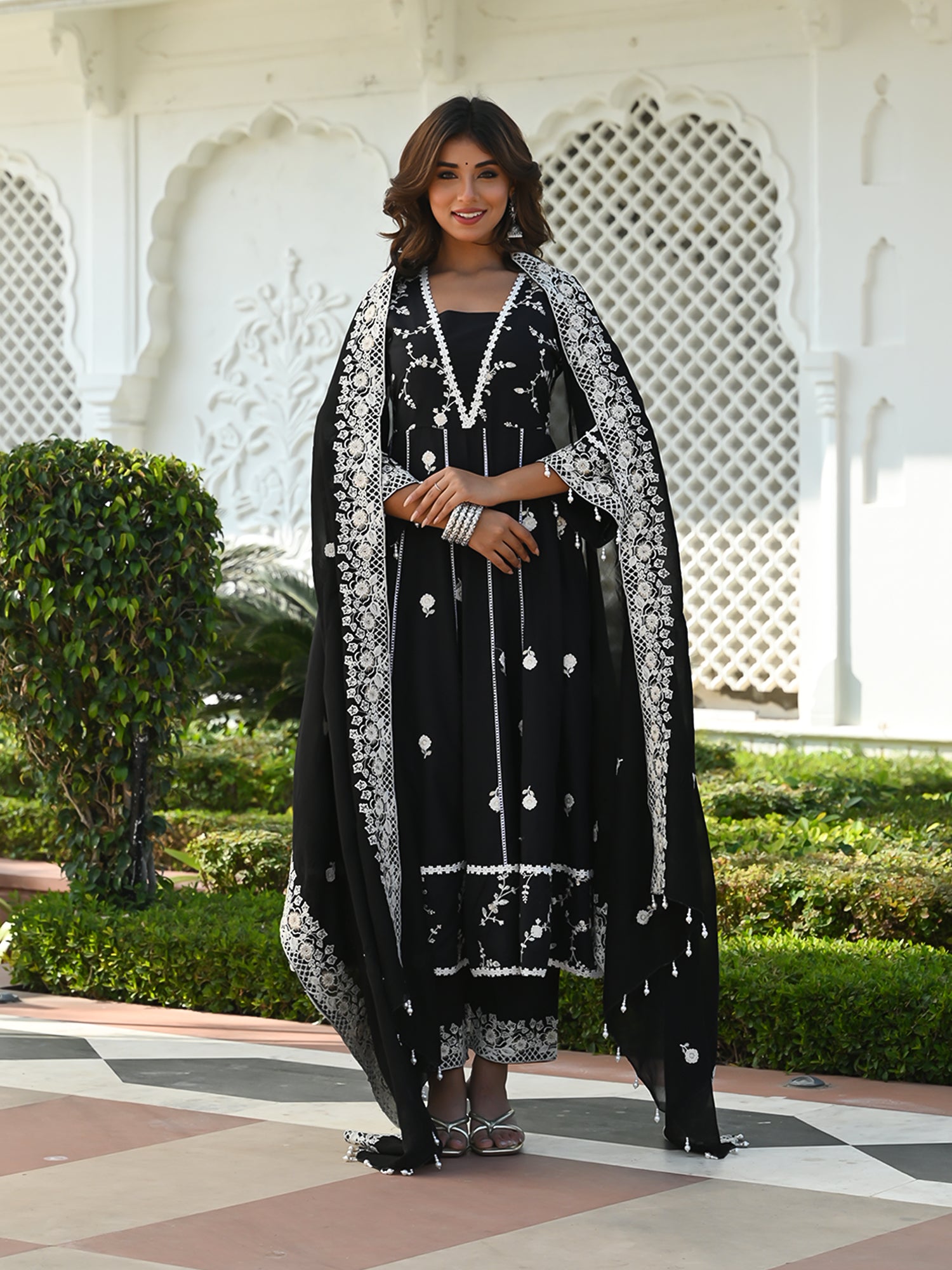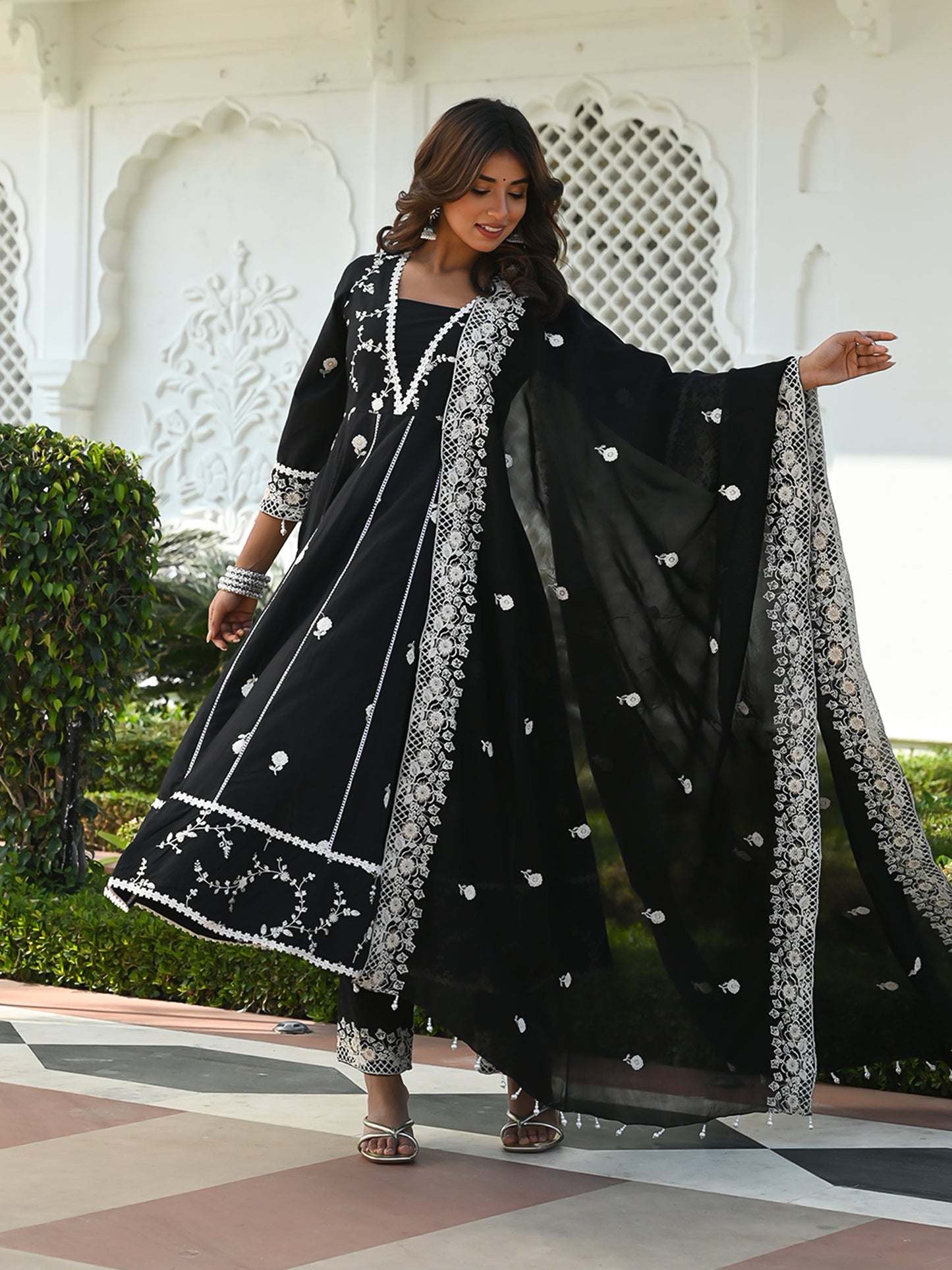 Enchanting mulmul Black Luna Anarkali Kurta adorned with intricate white thread embroidery. Silk organza dupatta exudes regality, while delicate white pearl detailing adds a touch of sophistication. A celebration essential for your glamorous wardrobe.