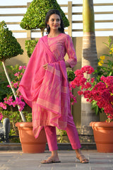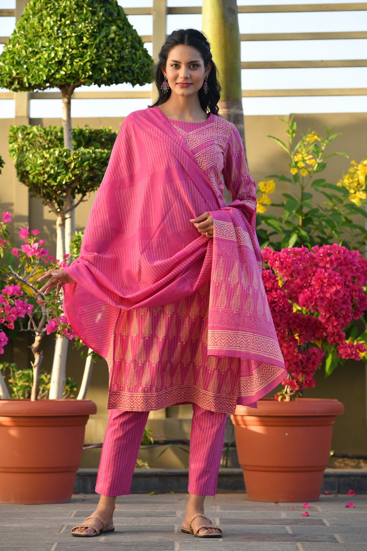 Fuchsia block-printed side slitted straight kurta featuring printed border on yoke, sleeves & bottom edges. Paired with printed cotton pants & dupatta.