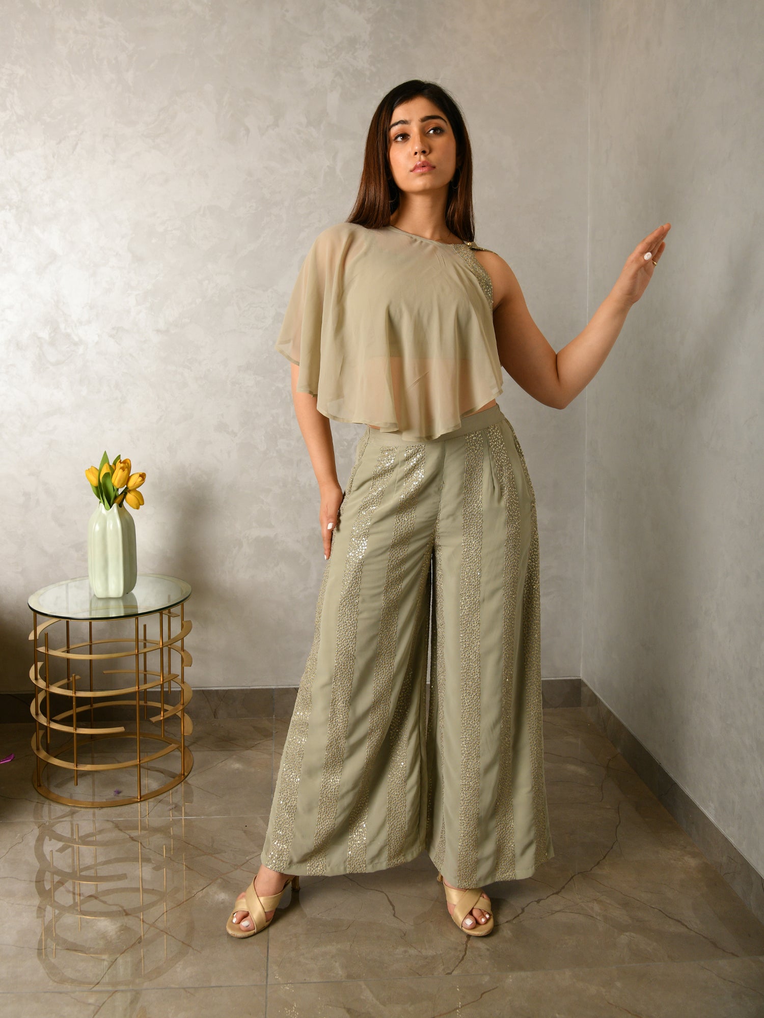 Opt. for our DIPTA SAGE GREY SEQUIN GEORGETTE CO-ORD SET for that festive yet trendy look. You can style this set as separates too.