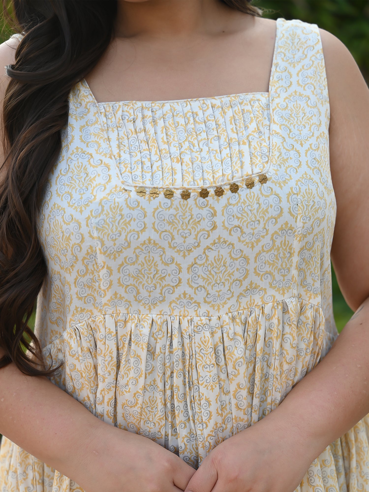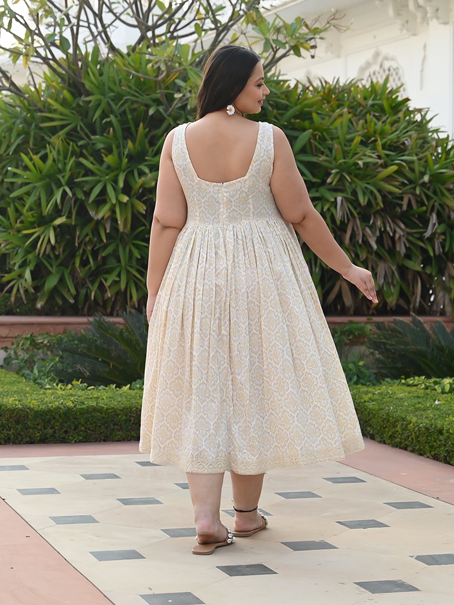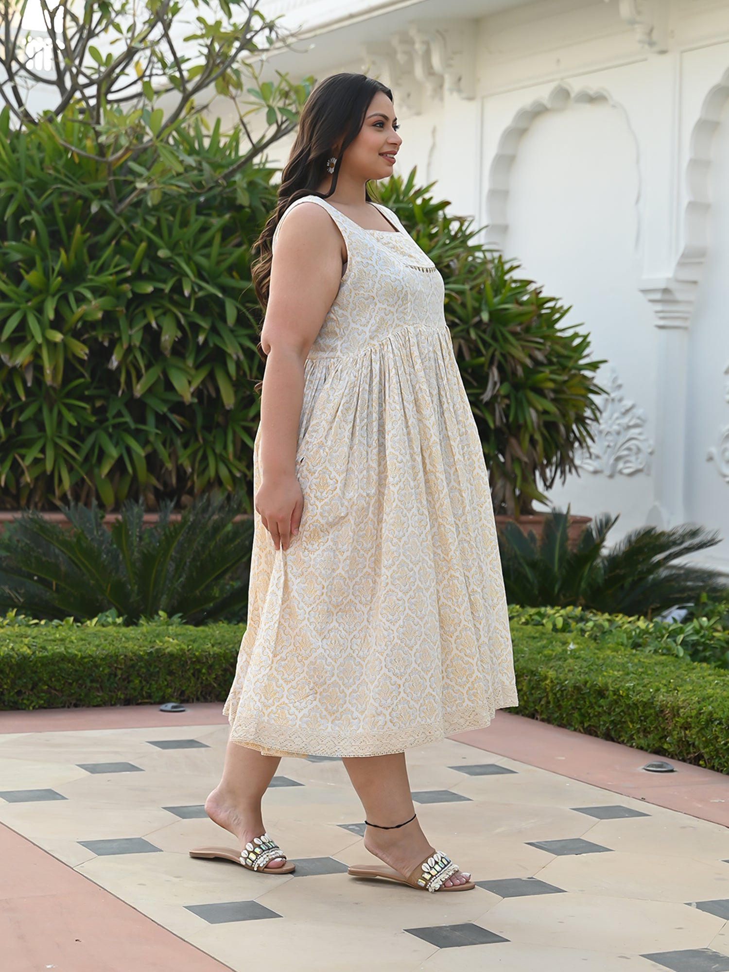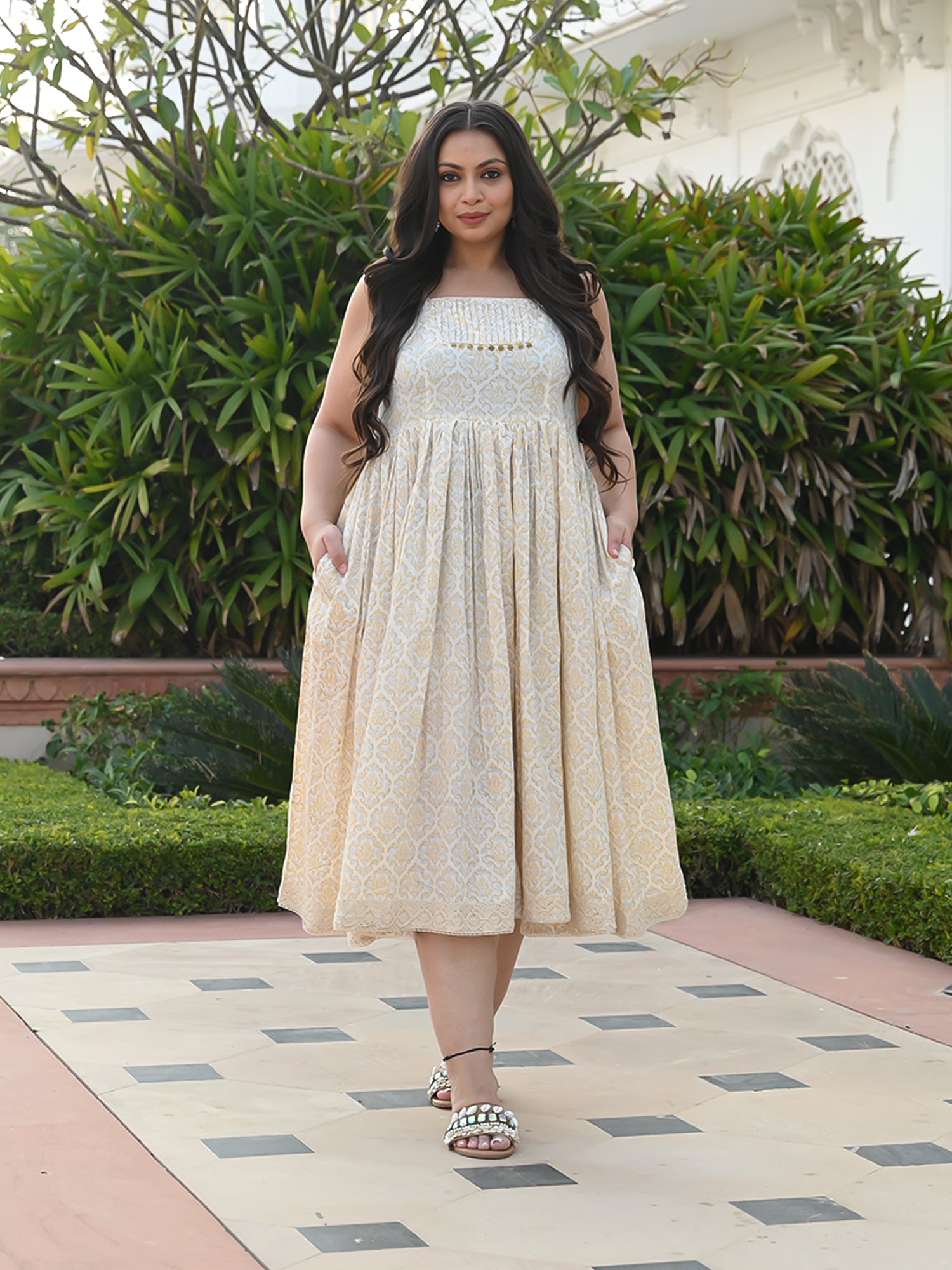 Introducing the "EILEEN" Cotton Satin Full Length Hand Block Printed Sleeveless Dress: Crafted from luxurious cotton satin fabric, the "EILEEN" dress is a perfect blend of comfort and style.