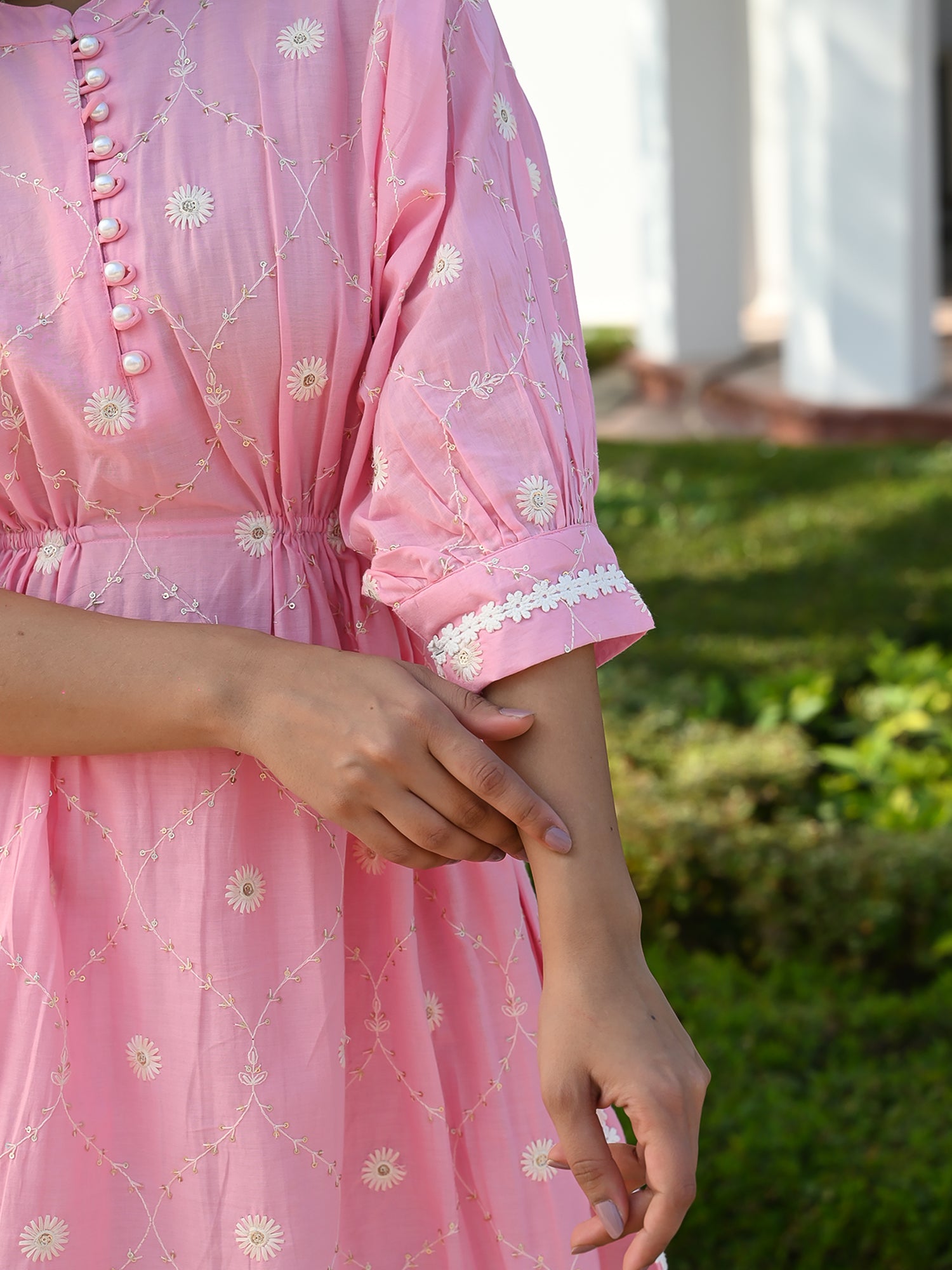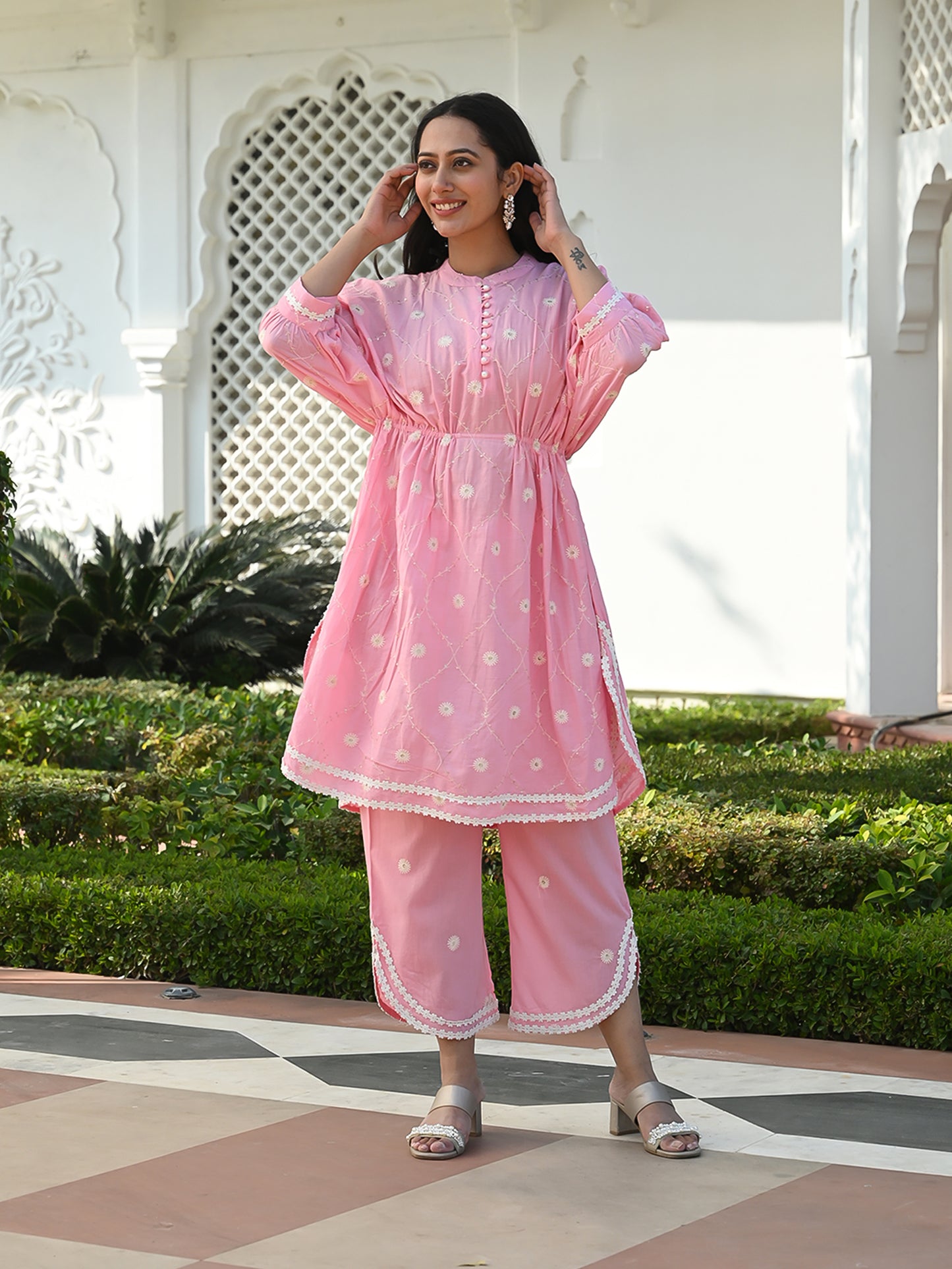 Presenting our stylish and cozy Indian ensemble, tailored for festive joy. The kaftan inspired shirt set features intricate white thread embroidery, forming a delightful floral jaal pattern along with lace detailing. Paired with cotton booti embroidered straight pant.