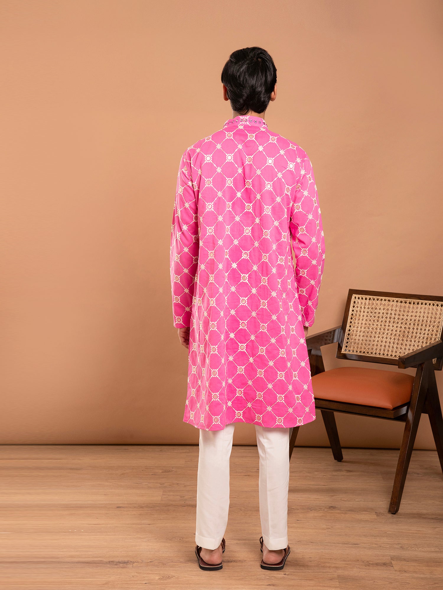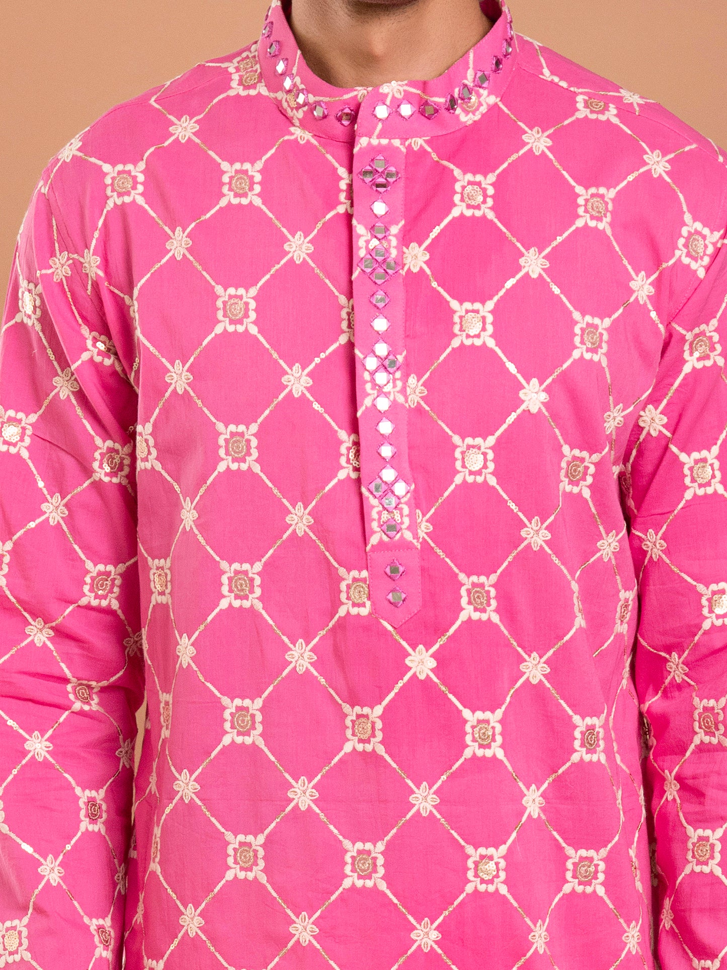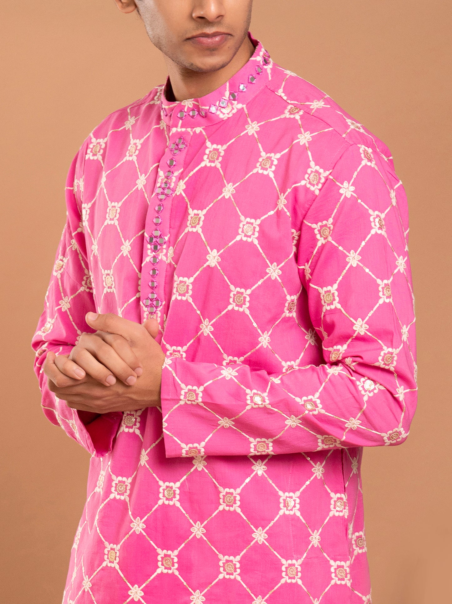 The "Mulmul Miransh Pink Mirror Work and Thread Embroidered Kurta-Pant Set" likely offers a stunning and ornate ensemble with intricate detailing. Whether it's a festive celebration, a special event, or an evening outing, this ensemble offers wearers a glamorous and sophisticated look. The pink color adds a touch of femininity and charm, making it suitable for a range of occasions.