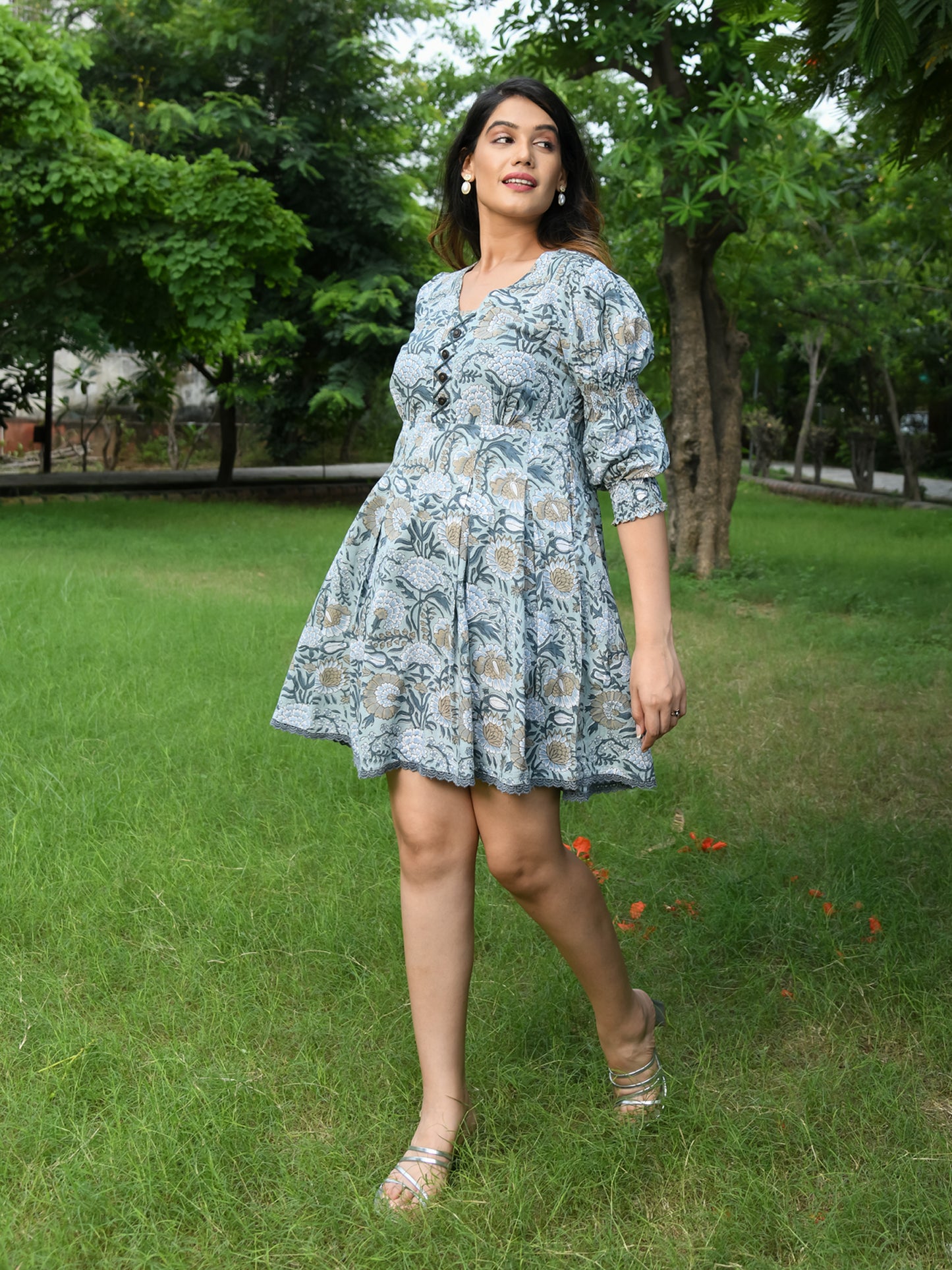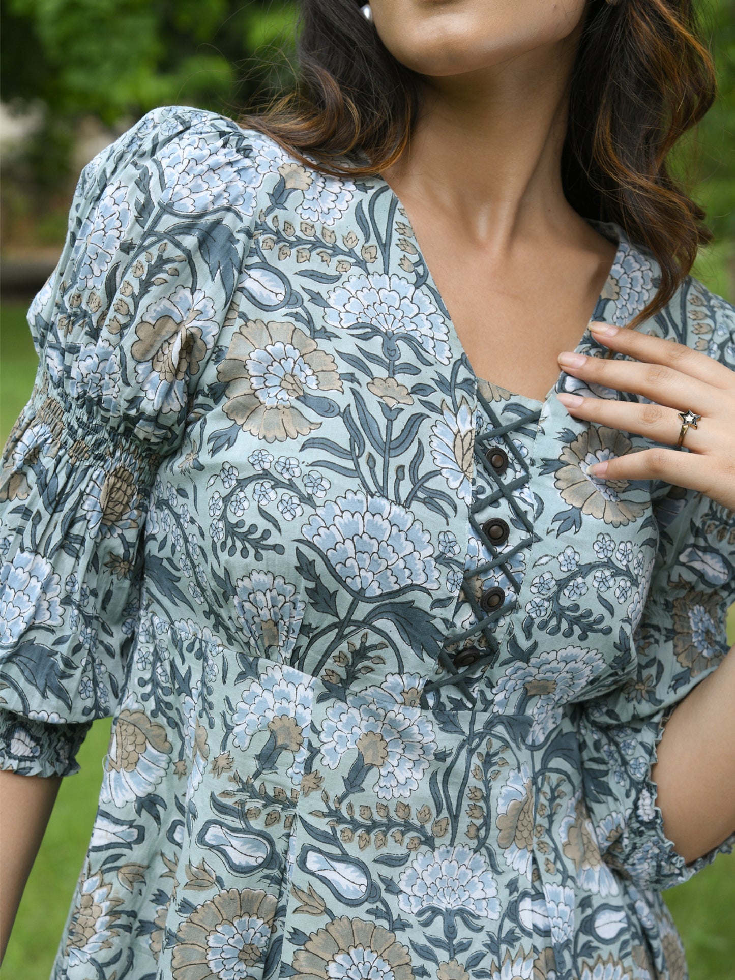 Our "NIRA" dress from the Sunshine Soiree Collection. Dress is a must-have for fashion enthusiasts who appreciate the beauty of hand block printing. Its exquisite details, such as the dyed lace, criss-cross bodice, fancy buttons, smocked sleeves, and V neckline, combine to create a dress that effortlessly blends style and comfort.