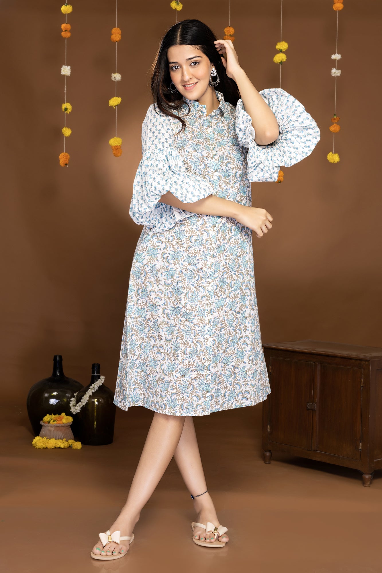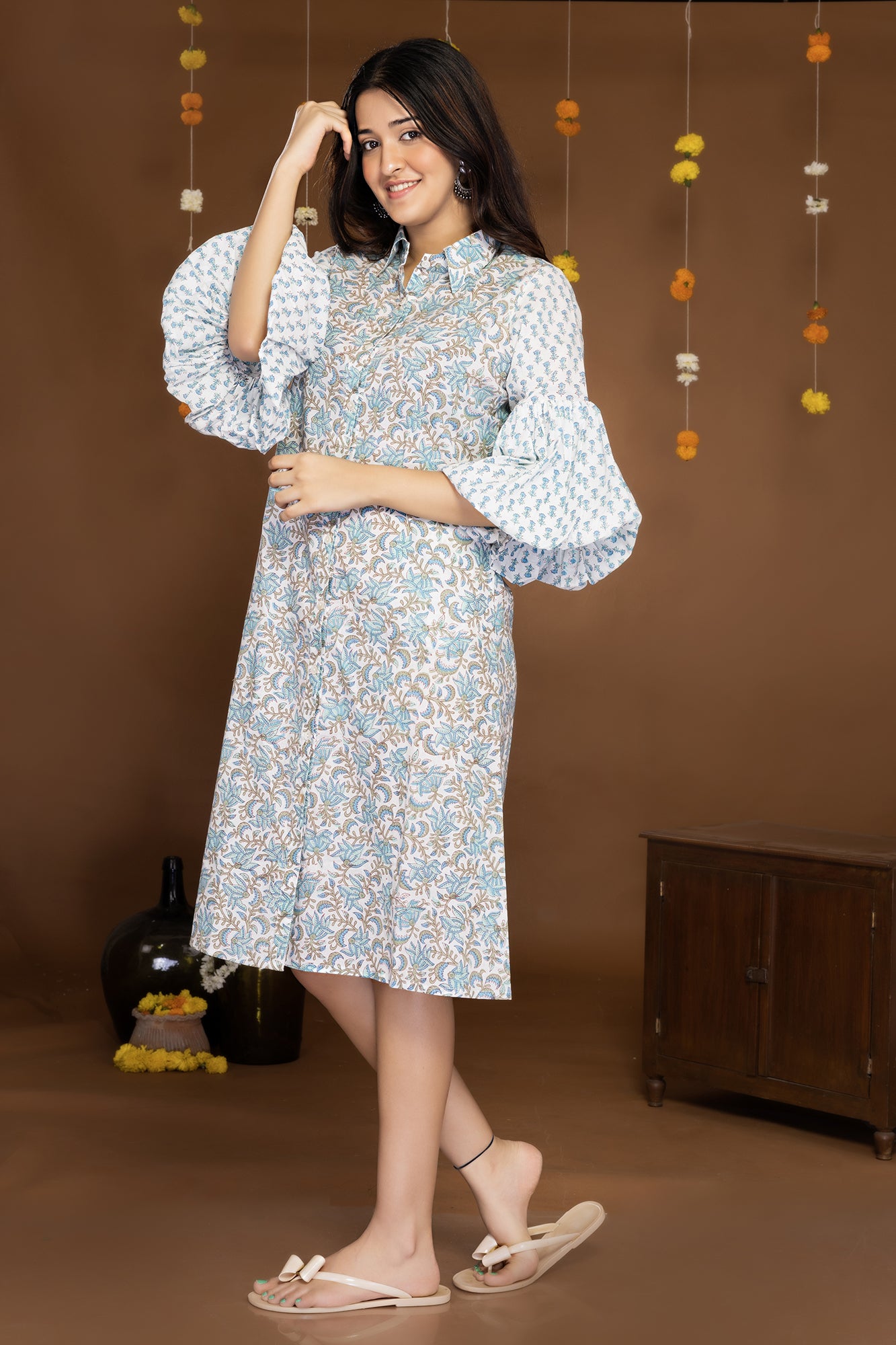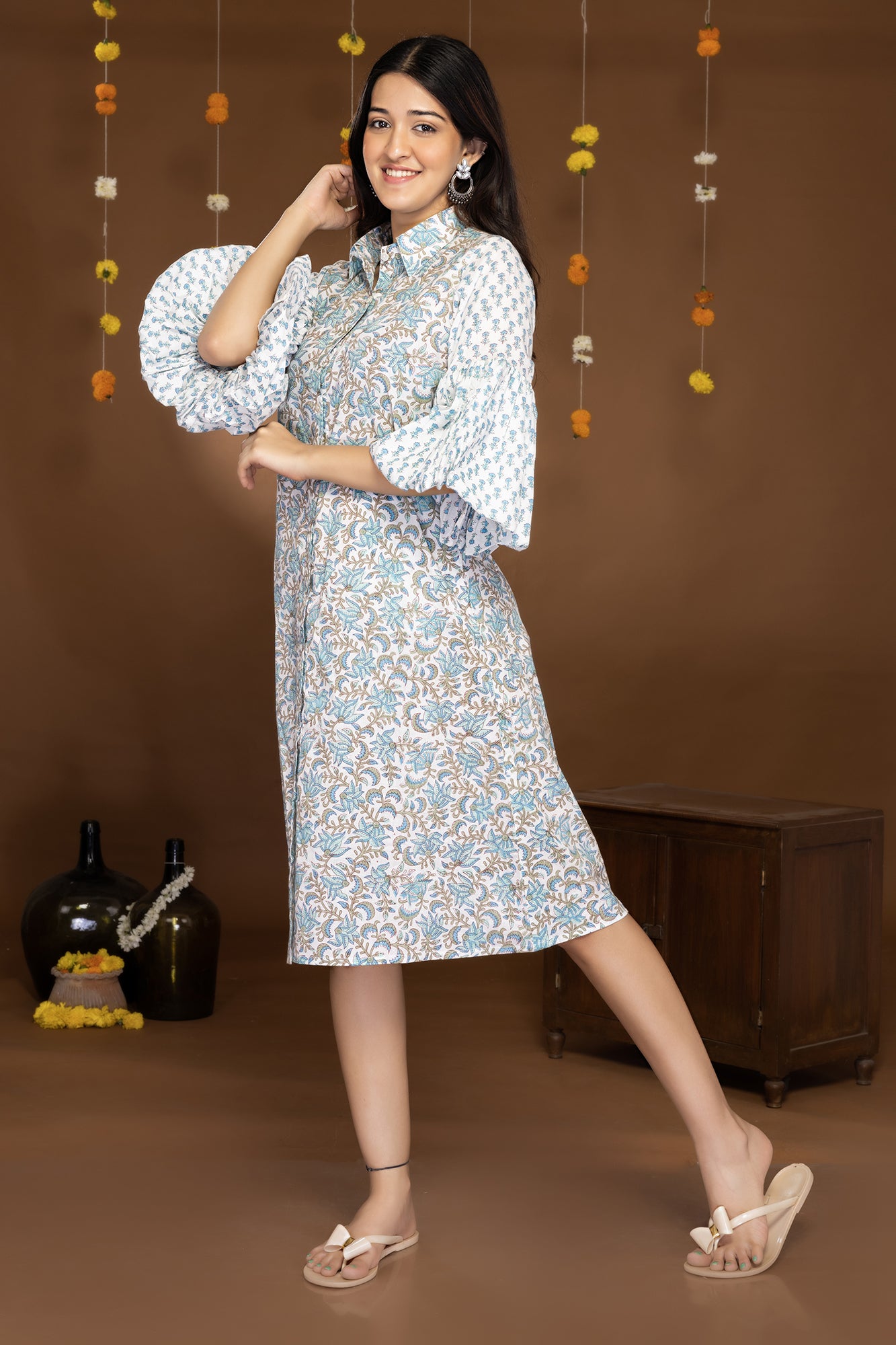 Step into the world of Mystic Blossoms and let this block printed midi shirt dress be a reflection of your inner beauty and vibrant spirit. Embrace the allure of nature and make a statement with your impeccable style.