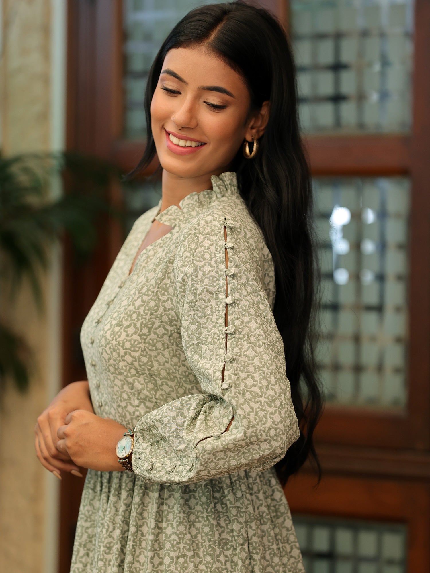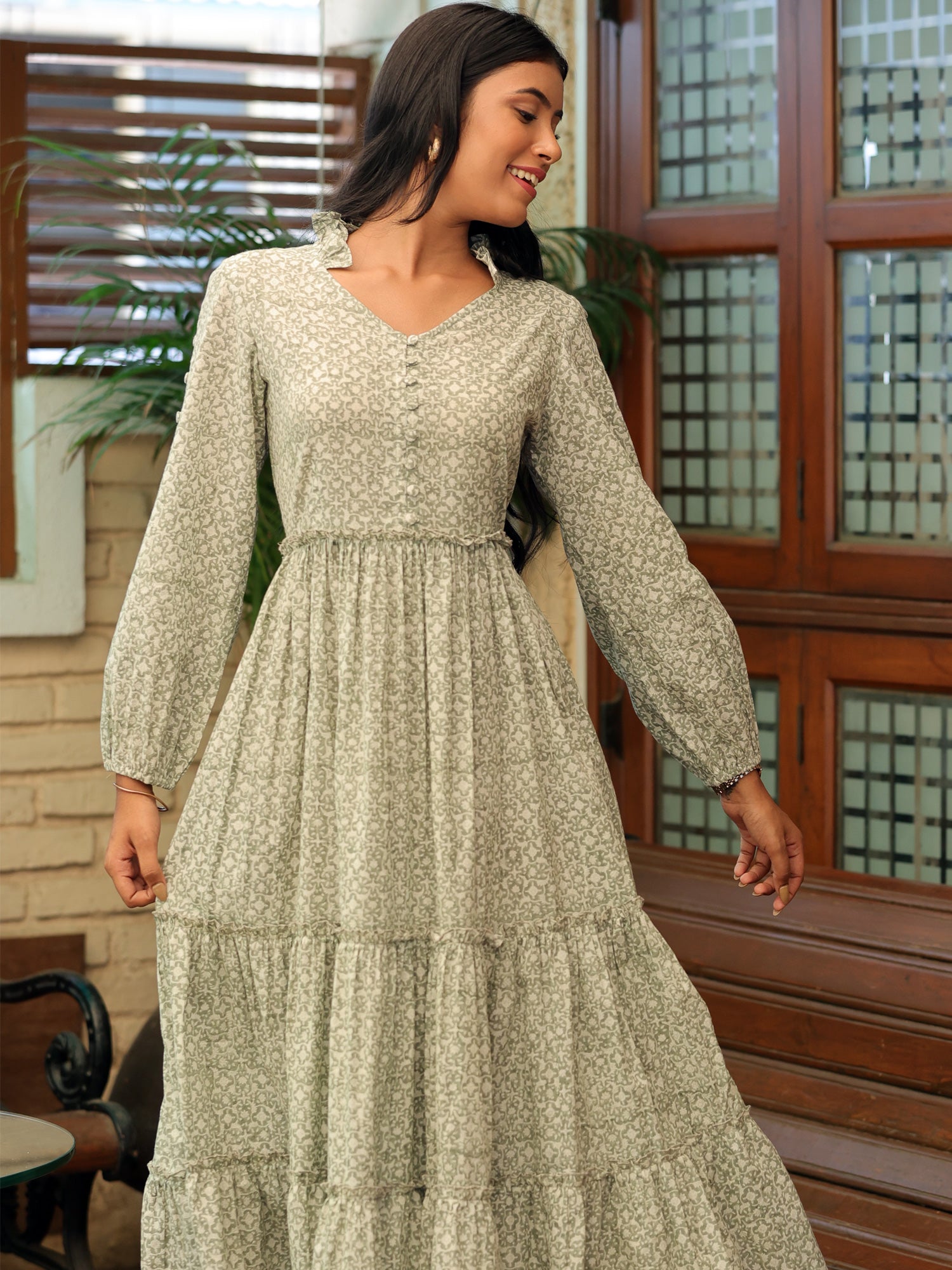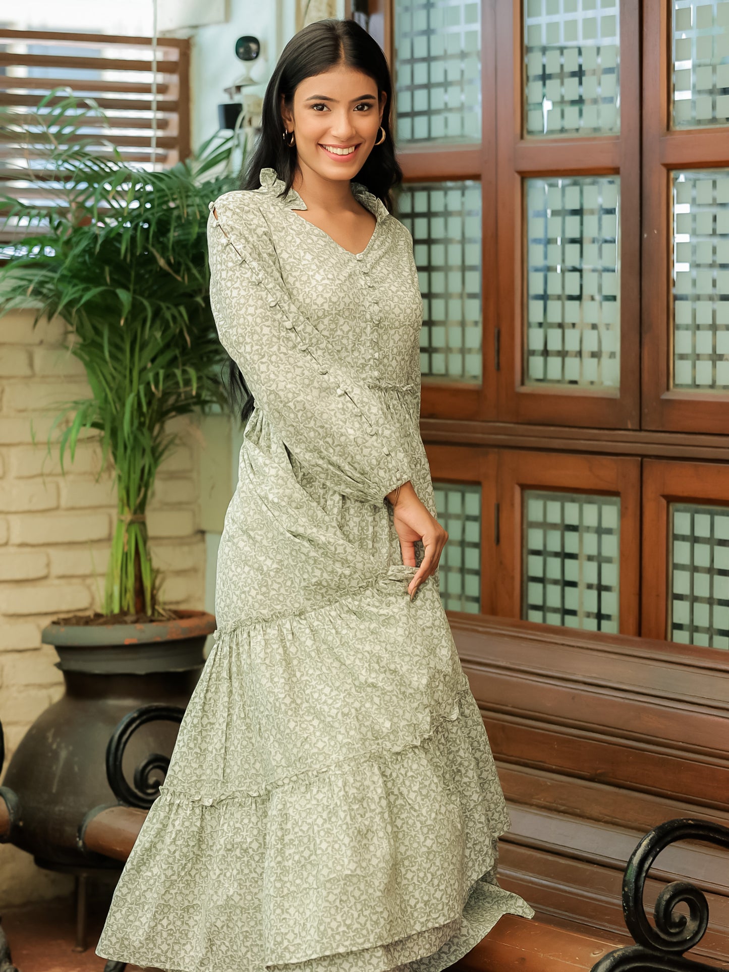 Crafted in a dusky olive shade, this maxi dress features a mesmerizing floral jaal block print that adds depth and intrigue to its design. The tiered silhouette creates movement and flow, while the button loops with handmade fabric buttons add a touch of artisanal craftsmanship.